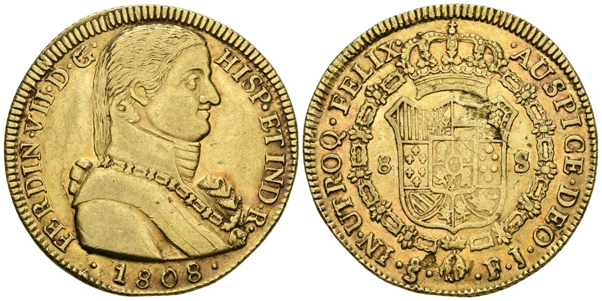 FERNANDO VII. 8 Escudos. 1808. Santiago FJ. Busto almirante. Cal-112; Cal. Onza 1341. Au. 26,93g. Ligero tono y hojita en reverso. MBC+. Rara.