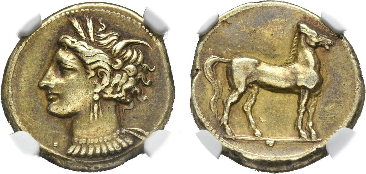 CARTAGO. Estátera. 310-270 a.C. Zeugitania. A/ Cabeza de Tanit a izquierda, con pendiente y collar triple, delante del cuello en el campo punto. R/ Caballo parado a derecha sobre una línea simple, bajo este dos puntos. Jenkins & Lewis Group V, 259-79; MAA 10; SNG Copenhagen 975. EL. 7,51g. Certificada por NGC. EBC.