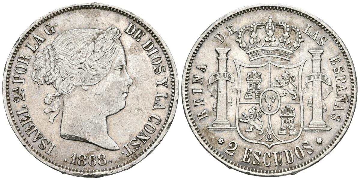 ISABEL II. 2 Escudos. 1868. Madrid. Cal-205. Ar. 25,96g. Marquitas y golpecitos en el canto. MBC+.