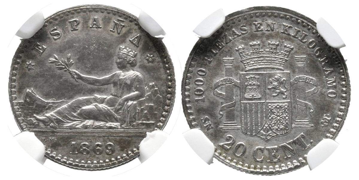 GOBIERNO PROVISIONAL. 20 Céntimos. 1869 *6-9 Madrid SNM. Certificada por NGC 4693349-003. Cal-18. Ar. Precioso tono. EBC-. Rarísima.