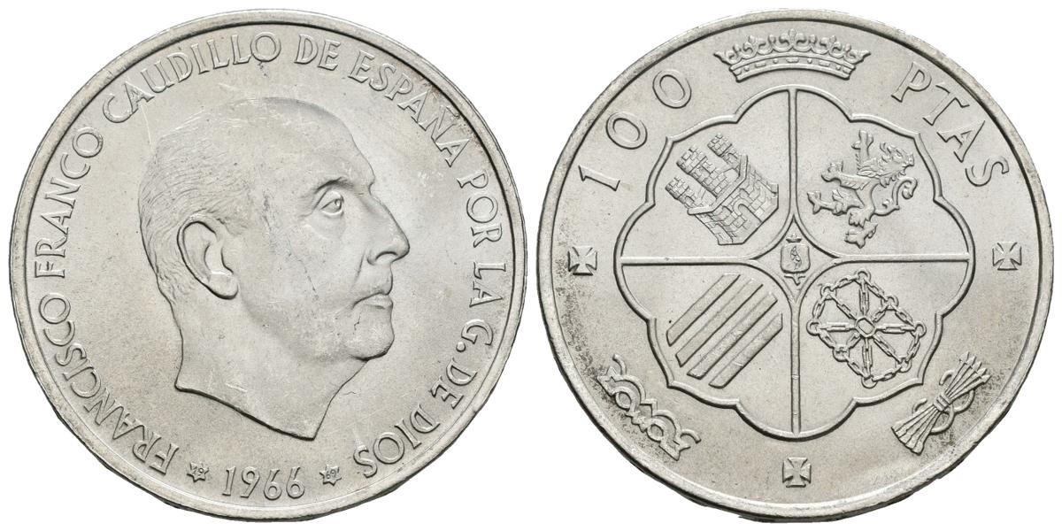 ESTADO ESPAÑOL. 100 Pesetas. 1966 *19-69 (Palo curvo). Cal-14. Ar. 18,95g. Brillo original. Rayita en anverso. SC-. Escasa.