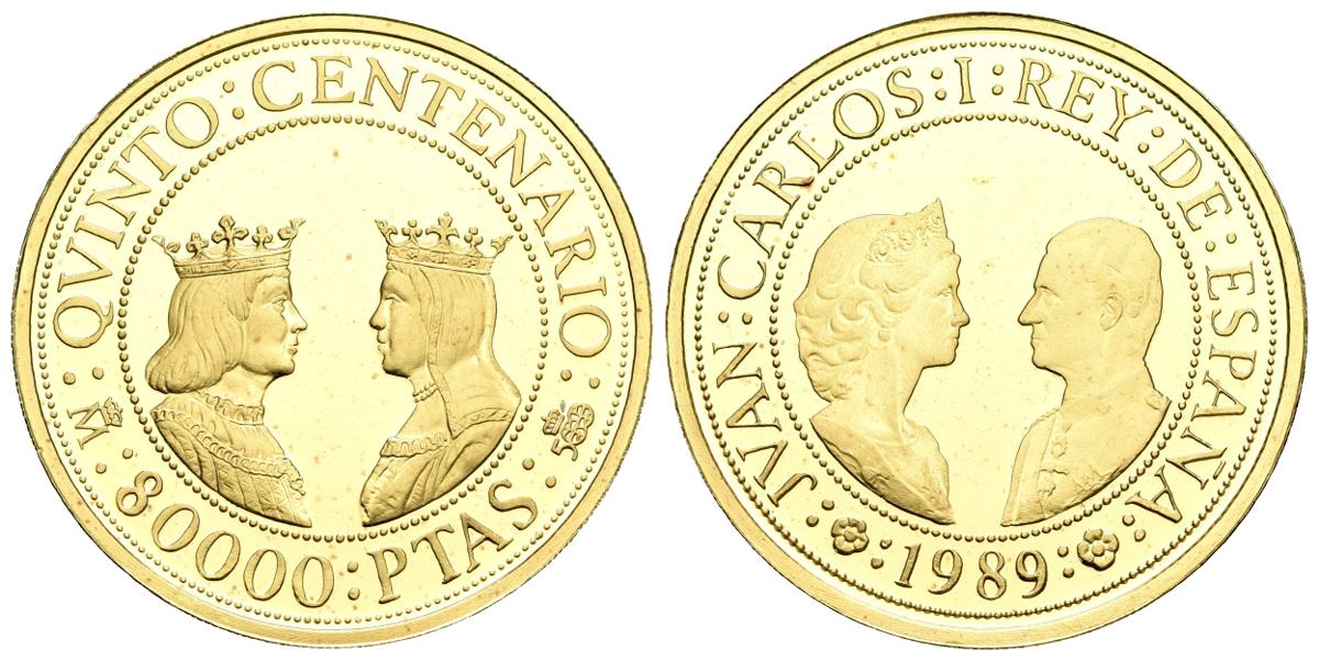 JUAN CARLOS I. 80.000 Pesetas. 1990. Quinto centenario de los Reyes Católicos. Au. 27,00g. Presentada en estuche oficial certificado. PROOF.