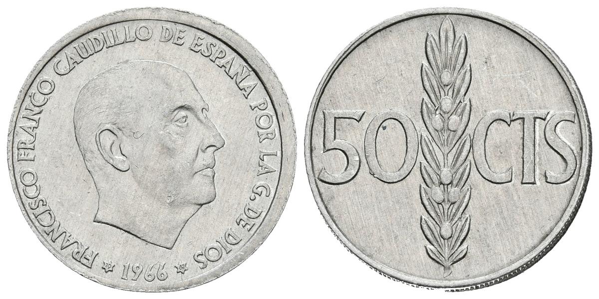 ESTADO ESPAÑOL. 50 Céntimos. 1966 *19-67. Acuñación desplazada y canto corona. Cal-114. Al. 0,96g. EBC-.