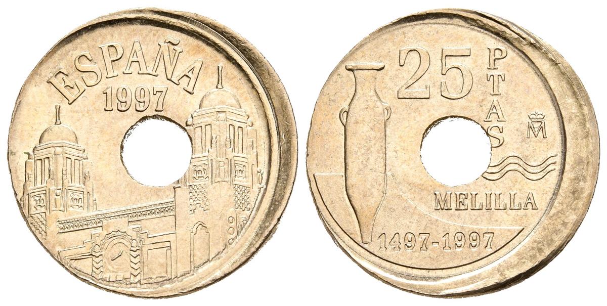 JUAN CARLOS I. 25 Pesetas. 1997. Acuñación desplazada 3 mm. 4,27g. SC. Rara.