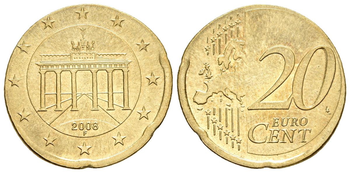 ALEMANIA. 20 Céntimos. 2008. Acuñados sobre una moneda de 10 Céntimos, su peso es de 4,08g (10 cts) cuando el peso de esta debería de ser 5,70g (20 cts). SC. Muy rara.