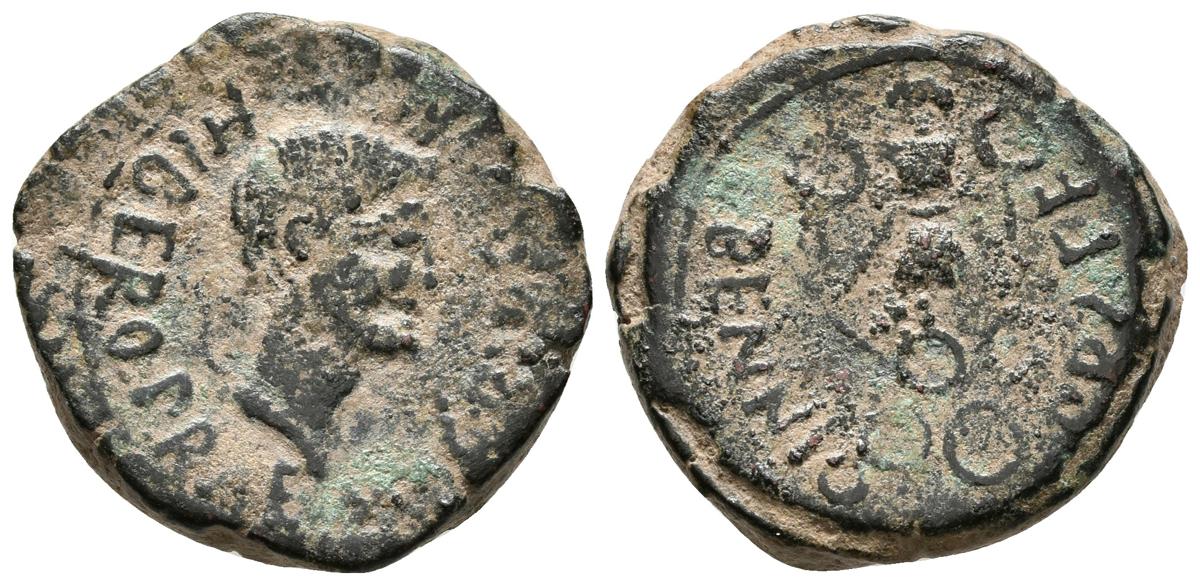 CARTAGONOVA. Semis. Epoca de Augusto. 27 a.C.-14 d.C. Cartagena (Murcia). A/ Cabeza masculina a derecha. HIBERO PRAEF. M. AGRIP. QVIN. R/ Trofeo sobre escudos. L. BENNIO PRAEF. FAB-589. Ae. 7,79g. MBC/MBC+.