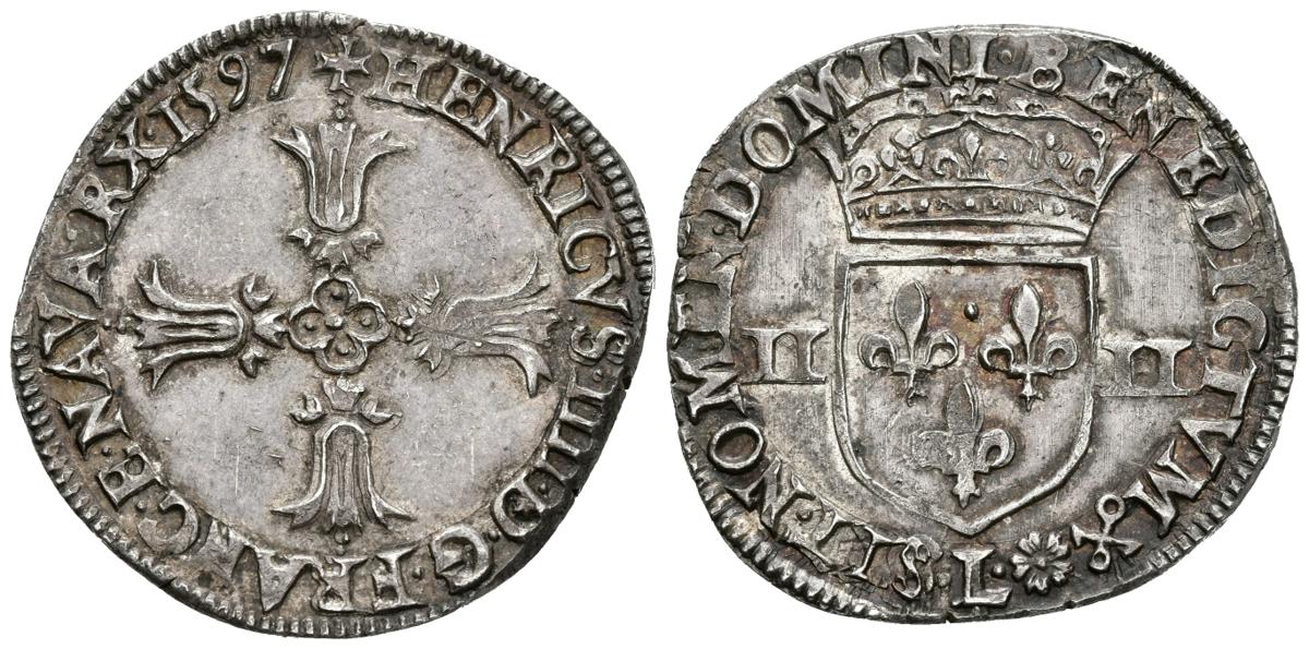 FRANCIA. Enrique IV. 1/4 Ecu. 1597. Bayona L. D. 1224. Ar. 9,63g. Preciosa pátina. SC-. Rara así. Ex Aureo & Calicó 307 Nº2639Ex Stack's Bowers 18-05-2017 Nº 72176.