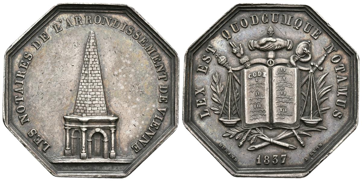 FRANCIA. Medalla. 1837. Lyon. A/ LES NOTAIRES DE L´ARRONDISSEMENT DE VIENNE. R/ Aguja de la ciudad de Viena. LES NOTAIRES DE L´ARRONDISSEMENT DE VIENNE. Grabador: Durand de Lyon. Lerouge 435. Ar. 16,26g. 33mm. Pátina. EBC.