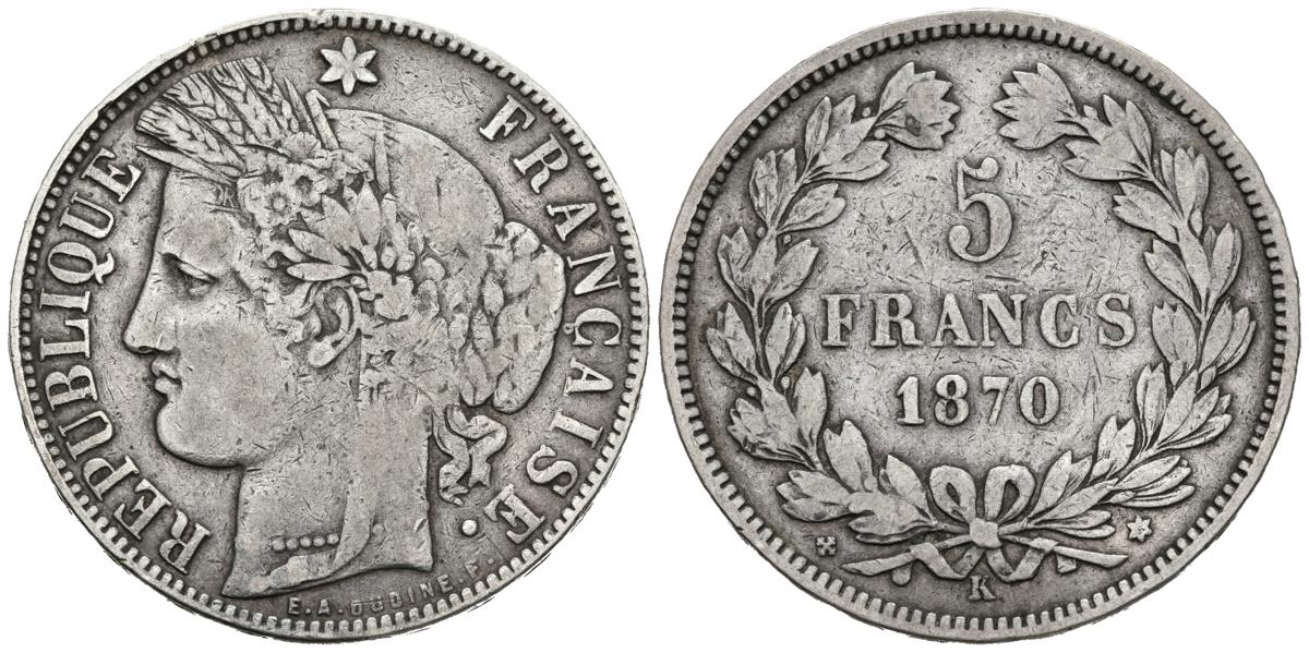 FRANCIA. 5 Francs. 1870. Bourdeaux K. Km#818.2. Ar. 24,83g. MBC-.