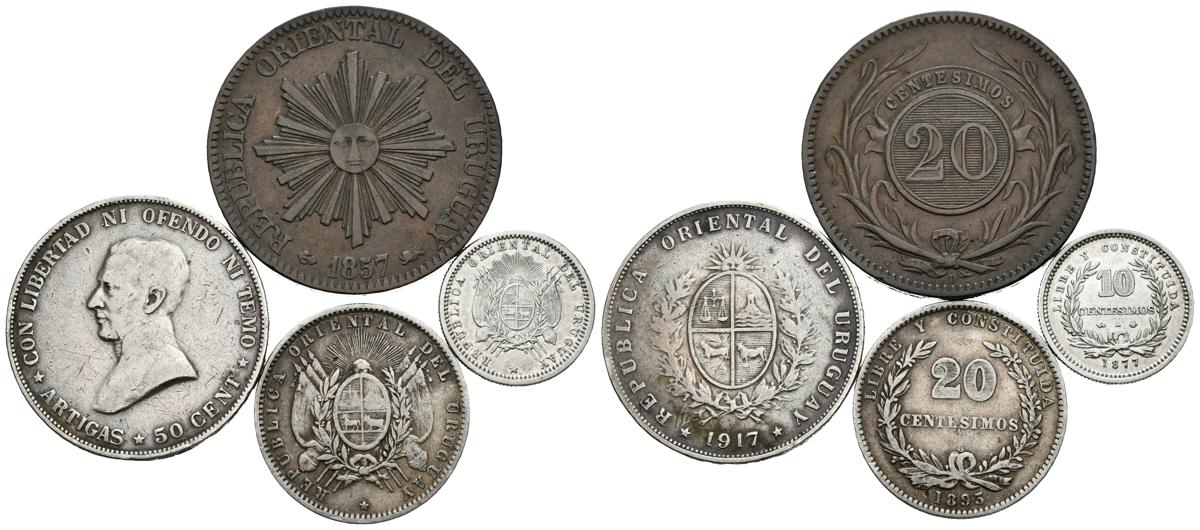 URUGUAY. 20 Centésimos 1857, 10 Centésimos 1877, 20 Centésimos 1893 y 50 Centésimos 1917. Ae/Ar. MBC-/MBC+.