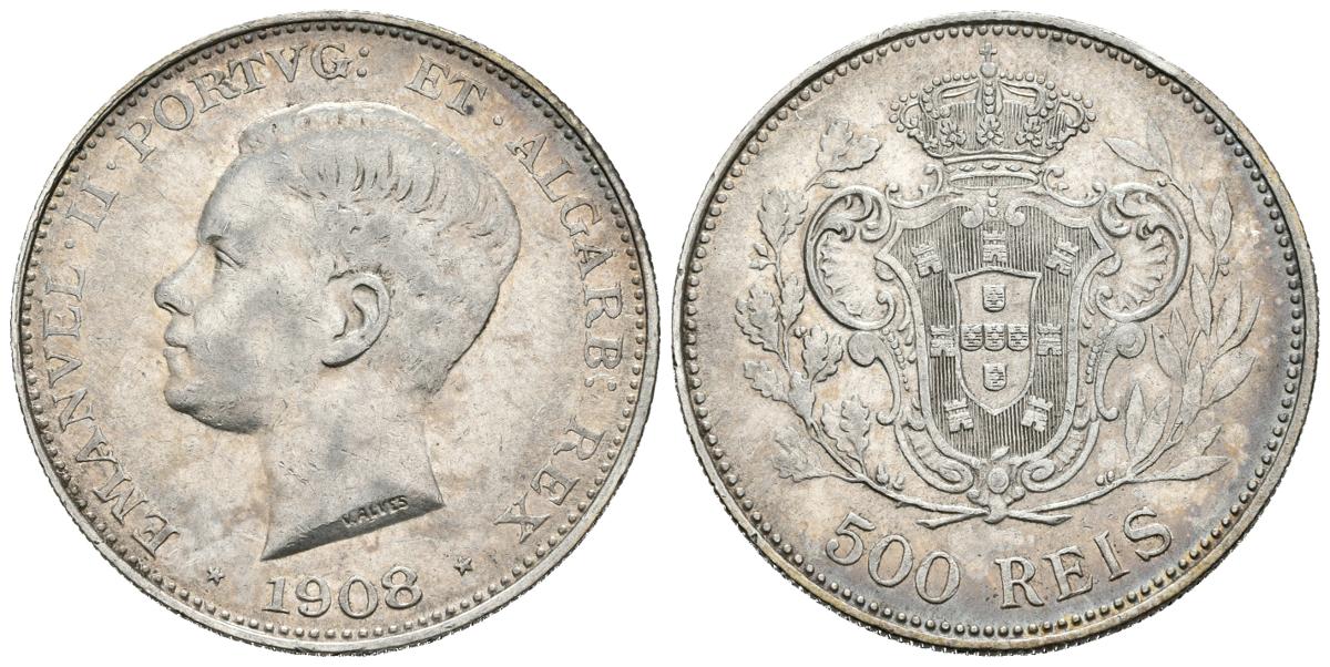 PORTUGAL. Manuel II. 500 Reis. 1908. Gomes 04.01. Ar. 12,54g. Pátina. MBC+.