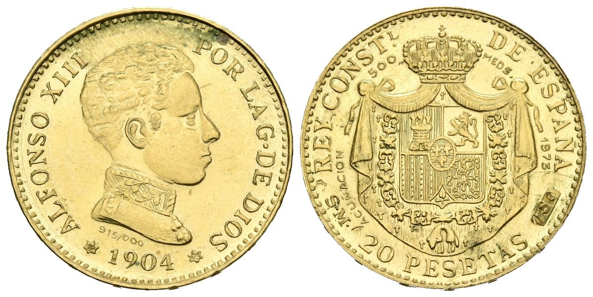 ALFONSO XIII. 20 Pesetas. 1904 *19-04. Acuñación de 500 Medallas (Nº 150). Au. 6,25g. SC.