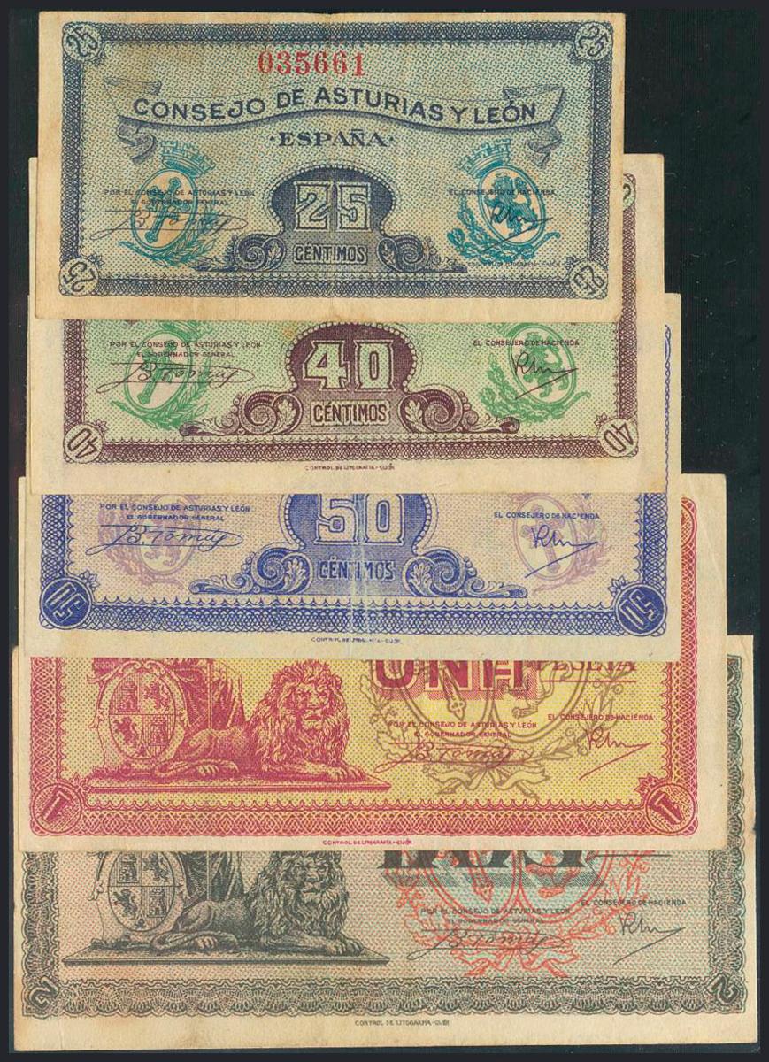 Serie completa 25 Céntimos, 40 Céntimos, 50 Céntimos, 1 Peseta y 2 Pesetas. 1937. Consejo de Asturias y León. (Edifil 2017: 394/98). MBC.