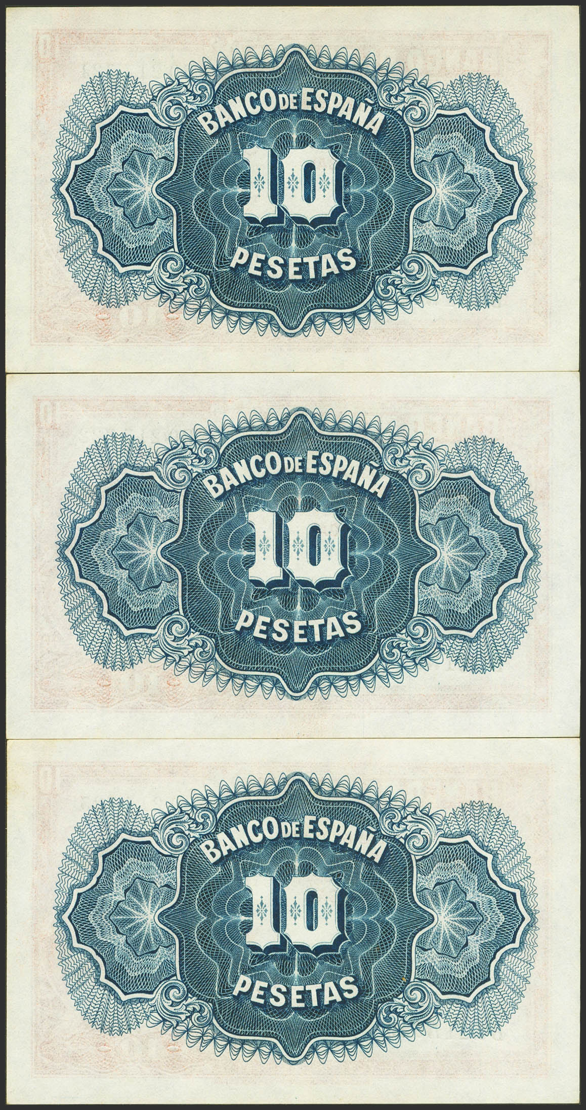 English 10 Pesetas. 1935. Silver Certificate. Correlative trio. Series B. (Edifil 2023: 364a). It retains all its original finish. Almost Uncirculated.
