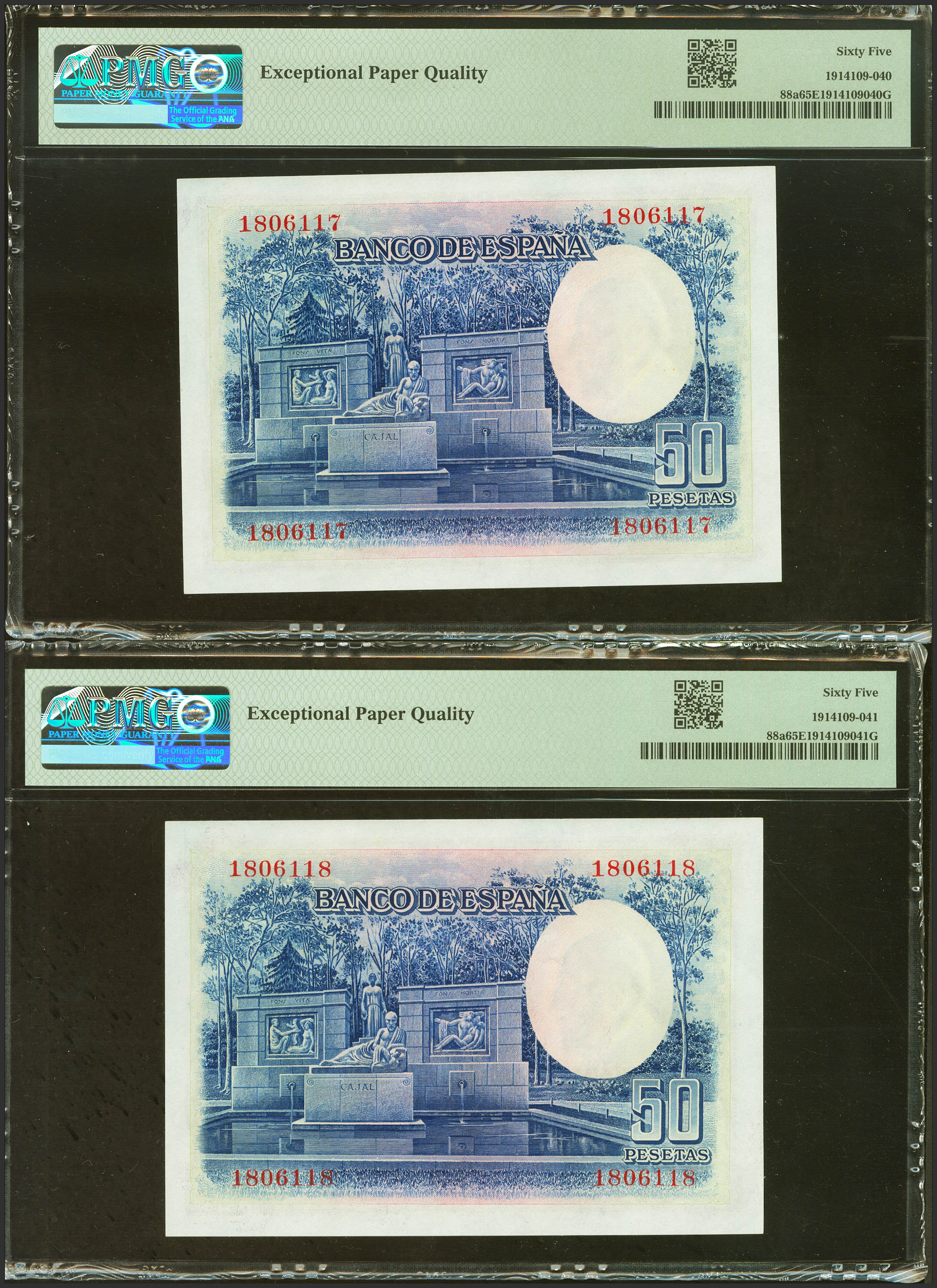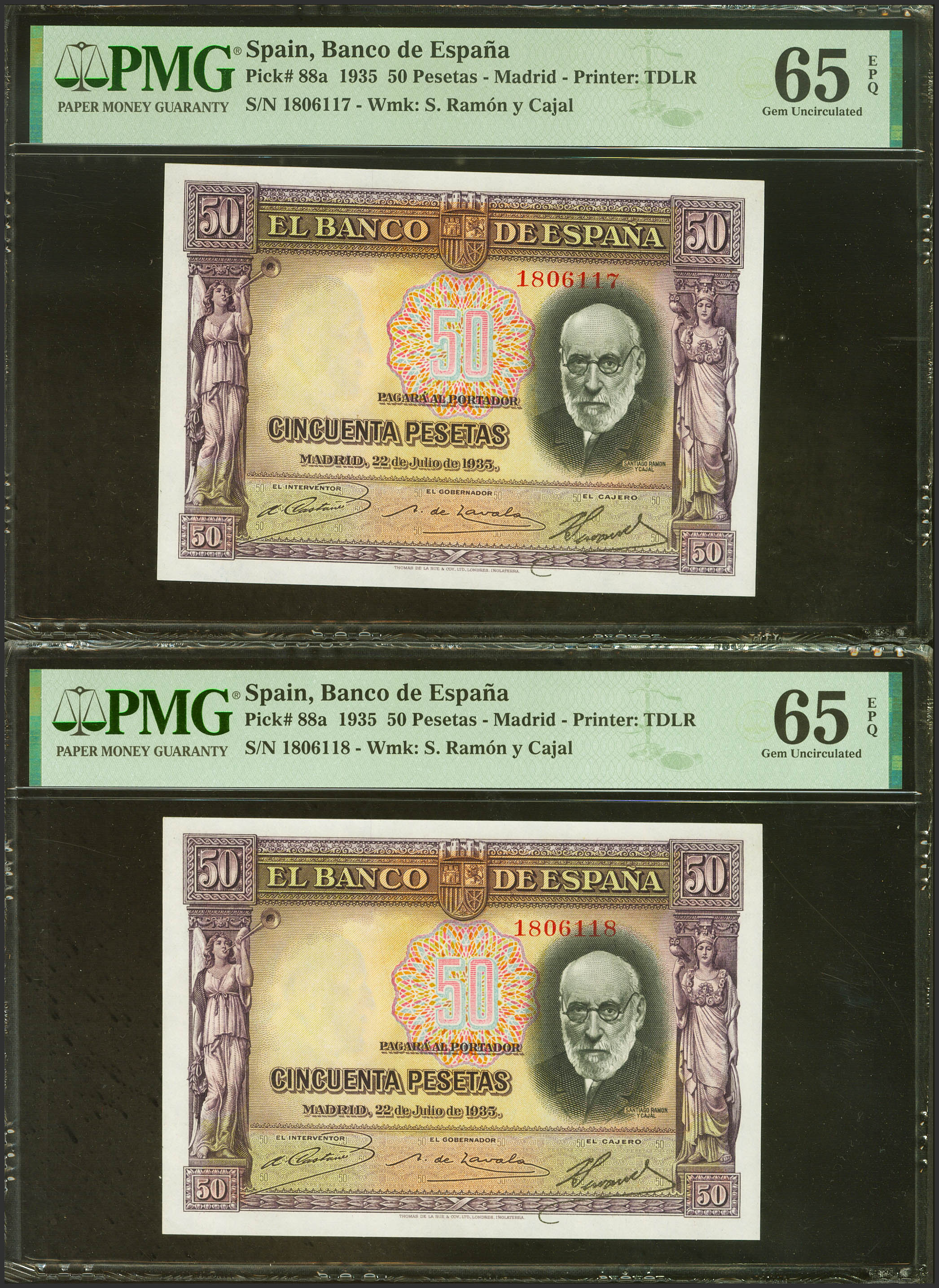 50 Pesetas. July 22, 1935. Correlative couple. No serie. (Edifil 2023: 366, Pick: 88a). Original sizing. Uncirculated. PMG65EPQ encapsulated, both.