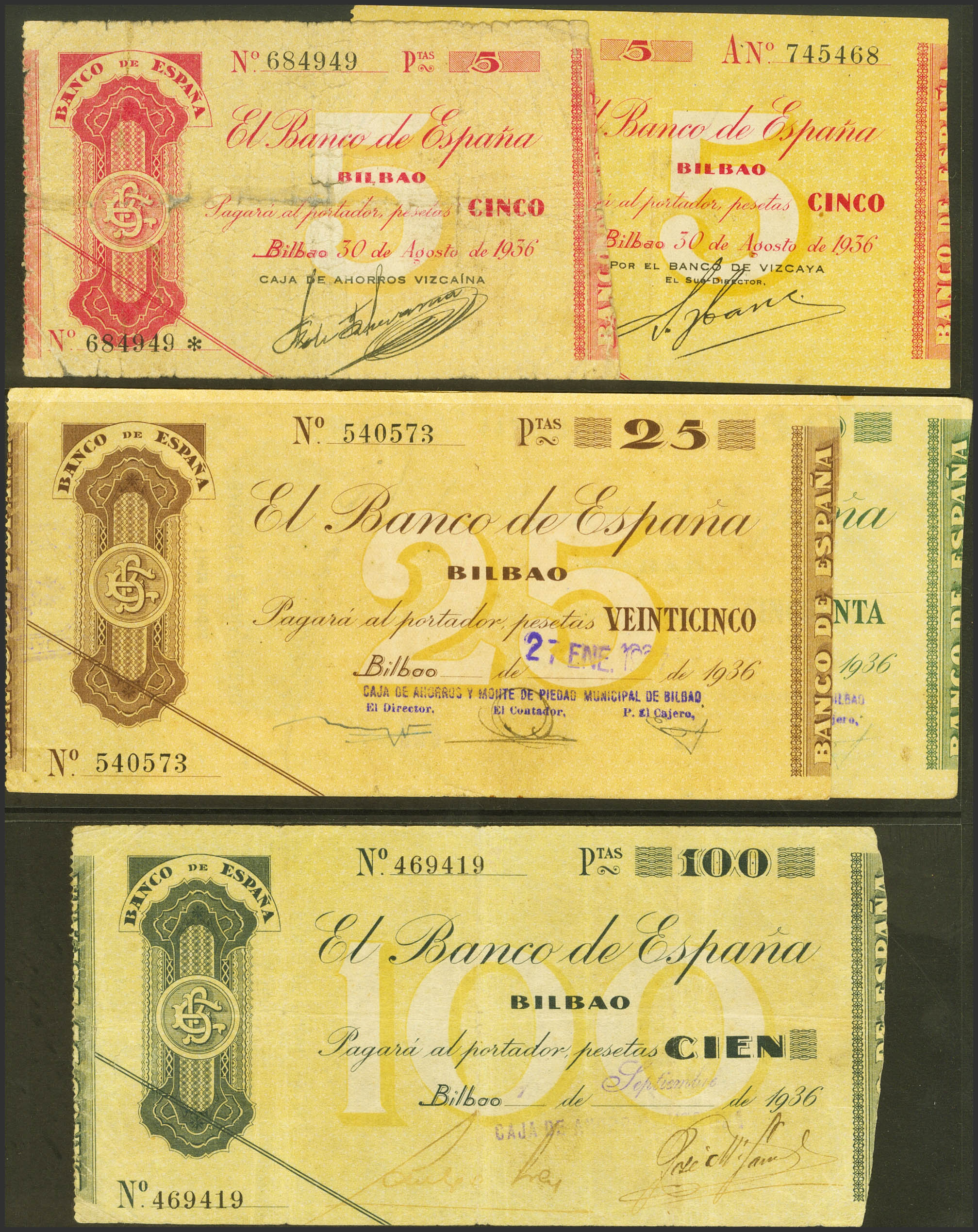Complete series of 5 Bank of Bilbao banknotes, issued in 1936 including the 5 Pesetas (without series and series A), 25 Pesetas, 50 Pesetas and 100 Pesetas. (Edifil 2021: 368/71). Good Fine/ Good Very Fine.