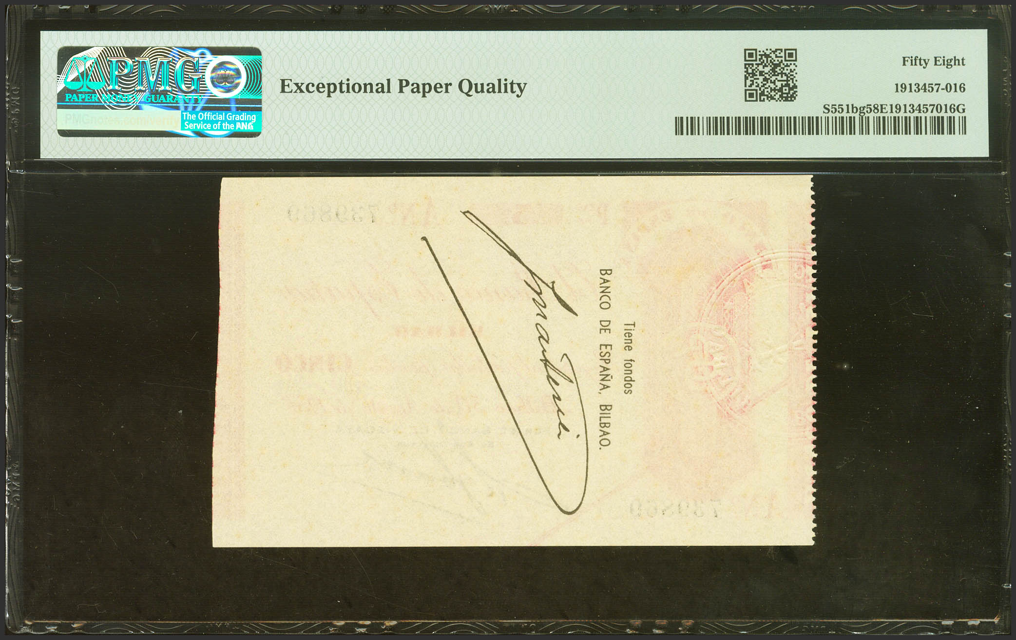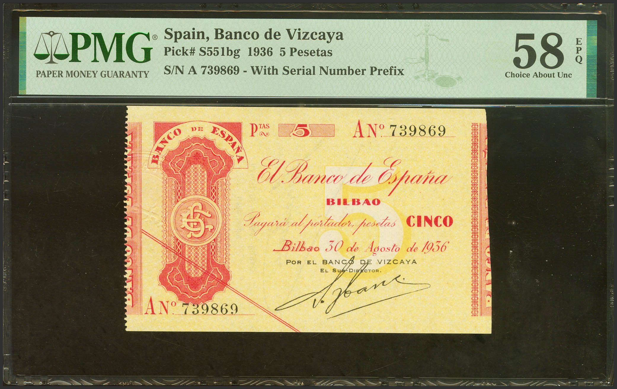 5 Pesetas. August 30, 1936. Bilbao Branch, presignature of the Banco de Vizcaya. Series A. (Edifil 2021: 368Aa, Pick: S551bg). Unusual in this exceptional quality, especially with original sizing, corrugation that does not break the fiber. EBC+++. PMG58EPQ package.