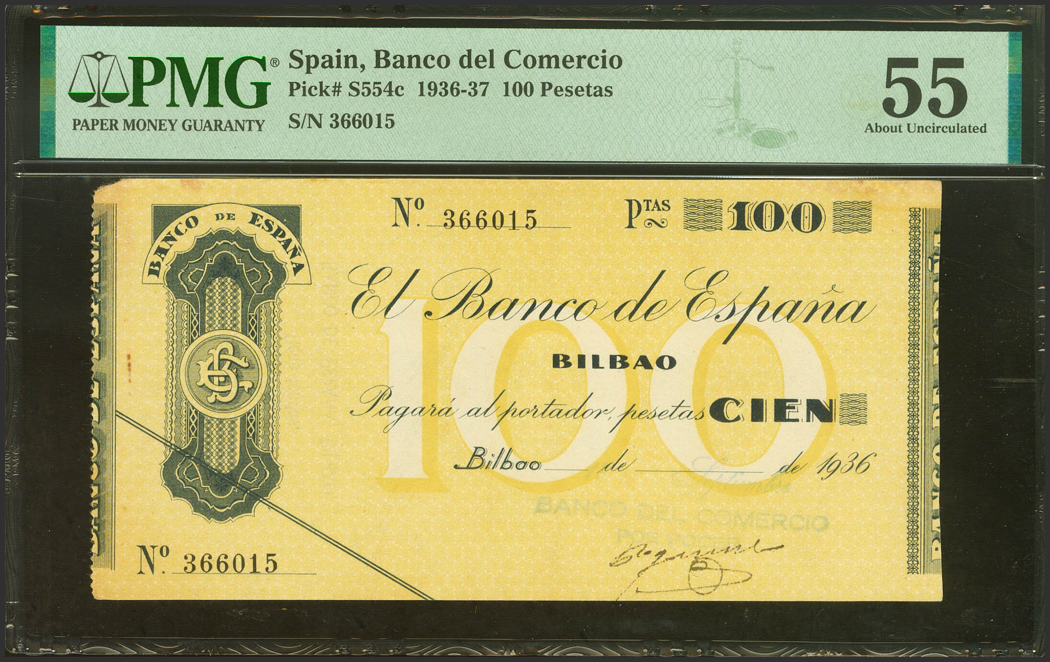 100 Pesetas. 1936. No series. Bilbao branch and pre-signature of Banco del Comercio. (Edifil 2023: 371c, Pick: S554c). Rare in this exceptional quality. Good Extremely Fine. PMG55 encapsulation (corner tip missing, minor stains).