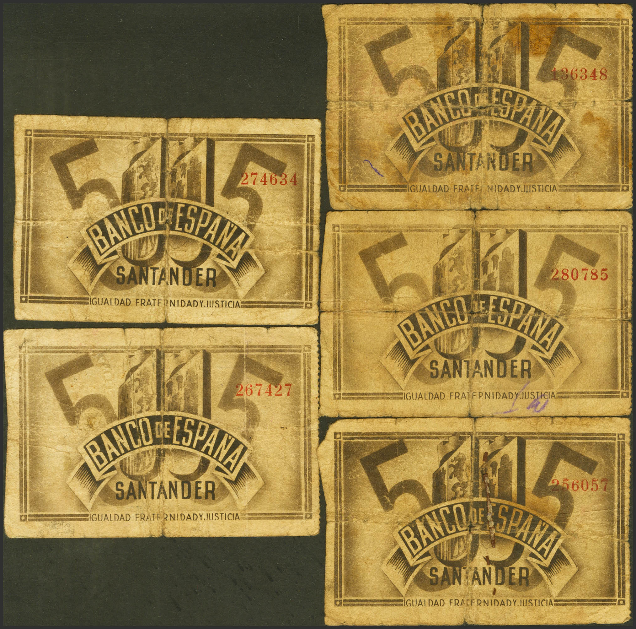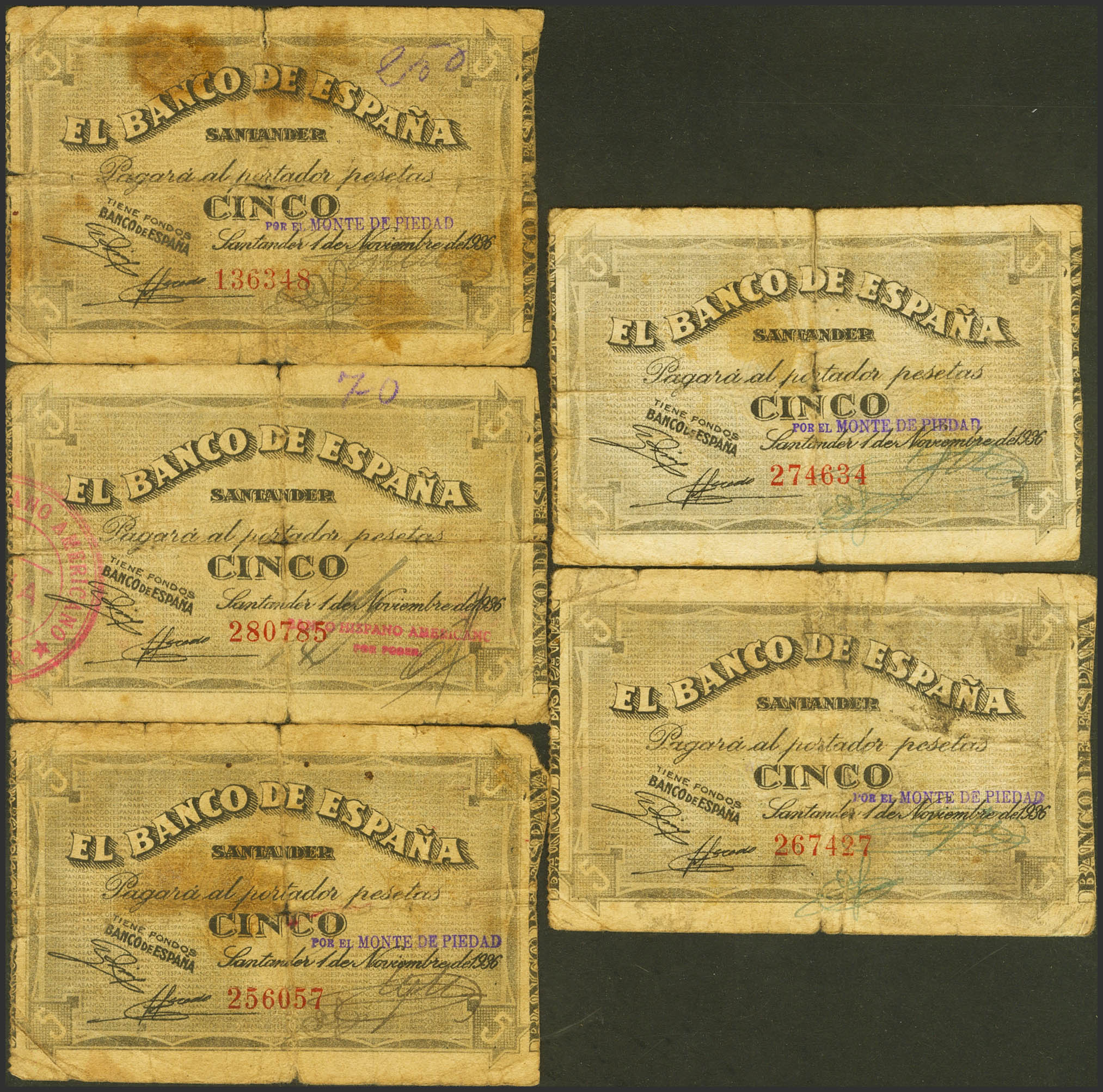 Set of 5 5 Pesetas banknotes from Banco de Santander, issued on November 1, 1936, all of them without series and with various antesignatures. (Edifil 2023: 375). Almost Very Fine/ Good Fine.