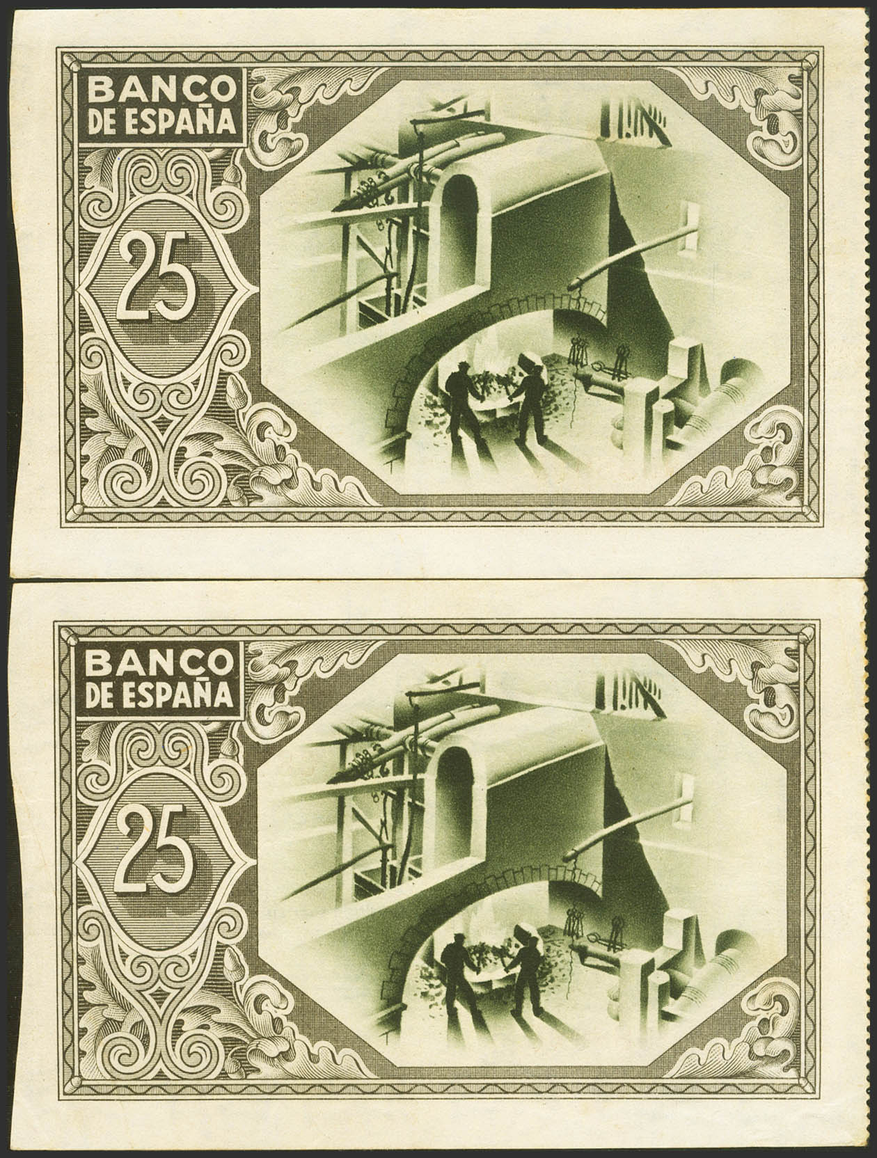 25 Pesetas. January 1, 1937. Correlative couple. Bilbao branch, presigned by Caja de Ahorros Vizcaína. No serie. (Edifil 2023: 388a). Almost Extremely Fine.