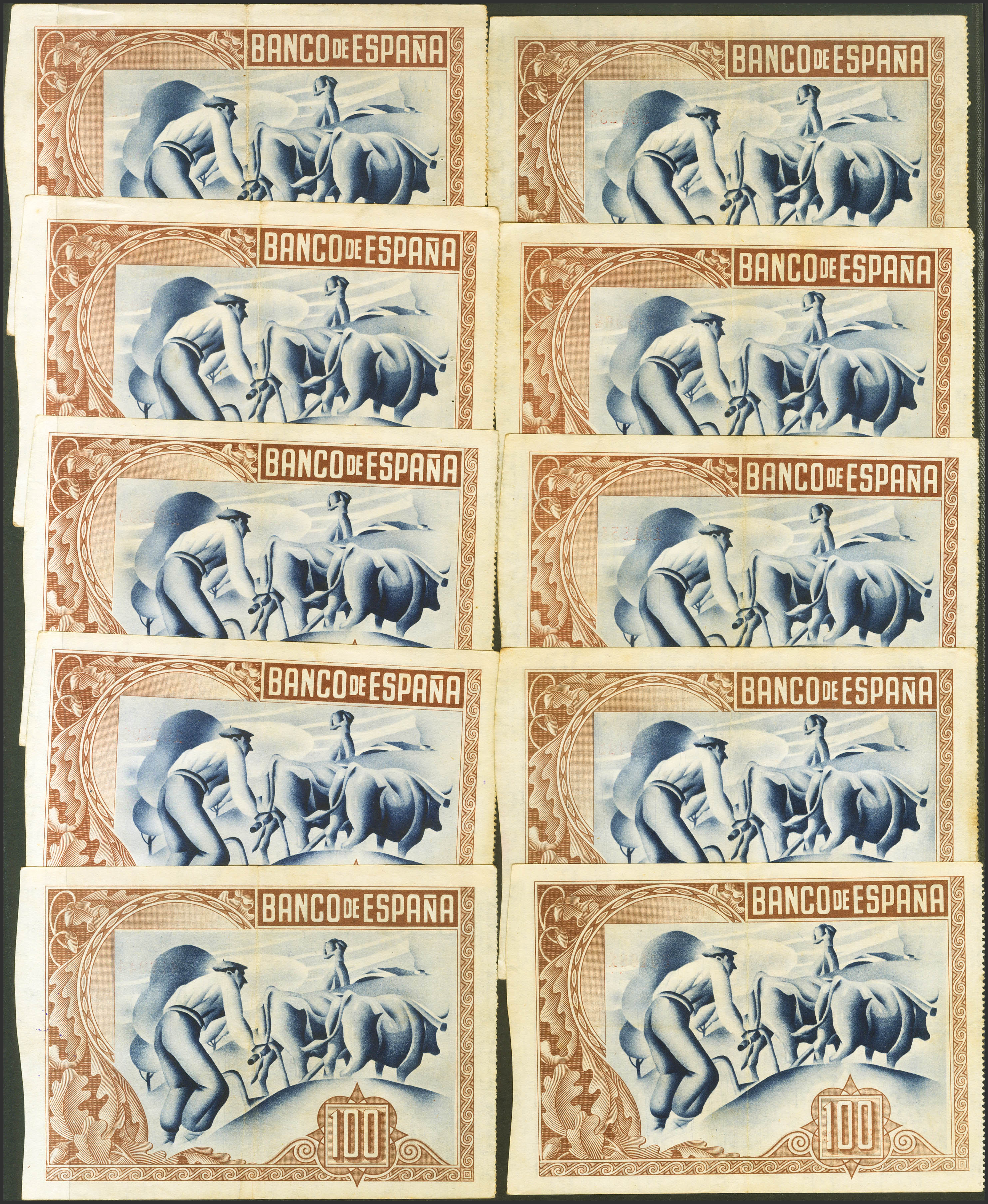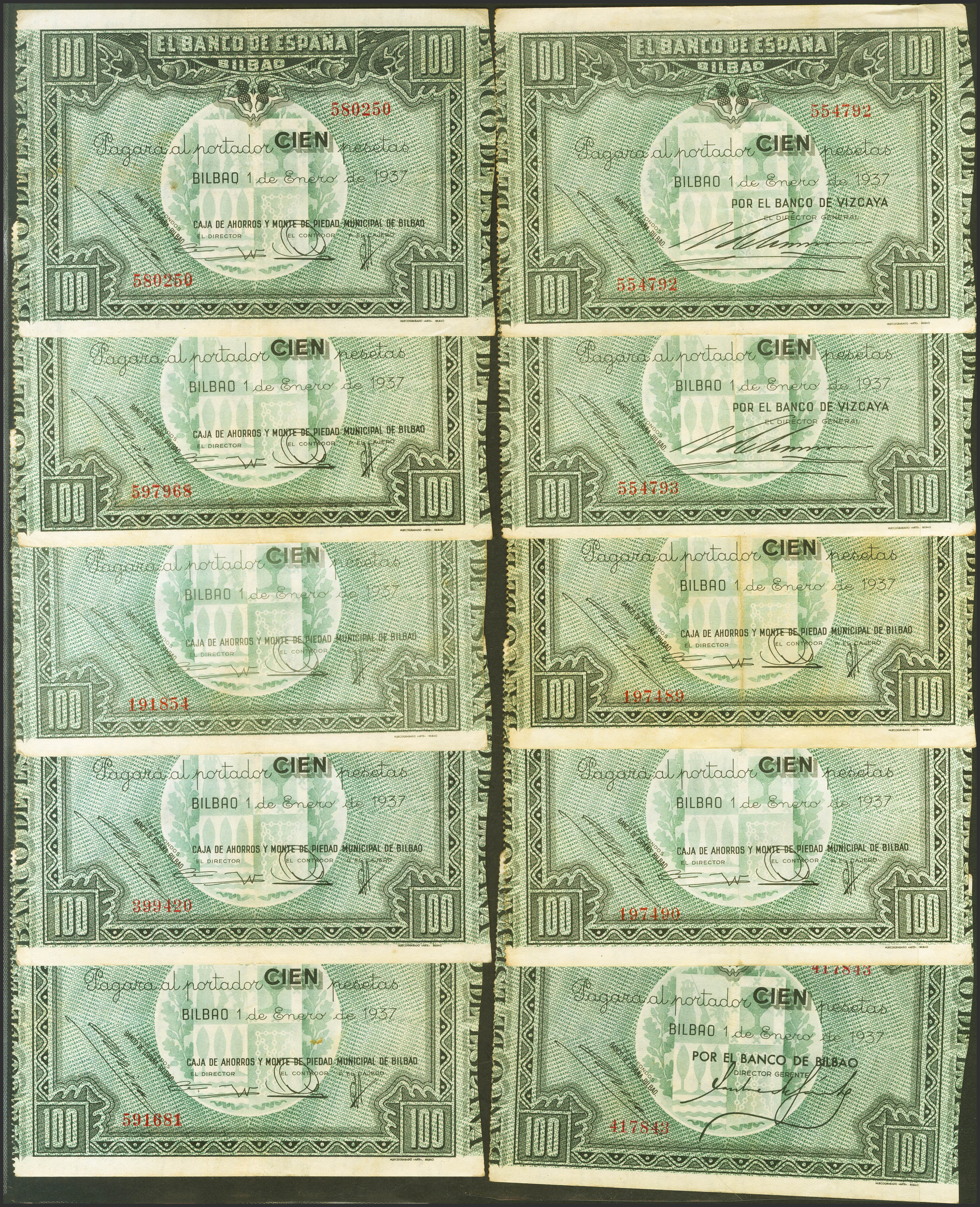 Set of 10 100 Pesetas banknotes from the Banco de Bilbao, issued on January 1, 1937, all of them without series and with various antesignatures. (Edifil 2023: 390). Extremely Fine/ Good Very Fine.