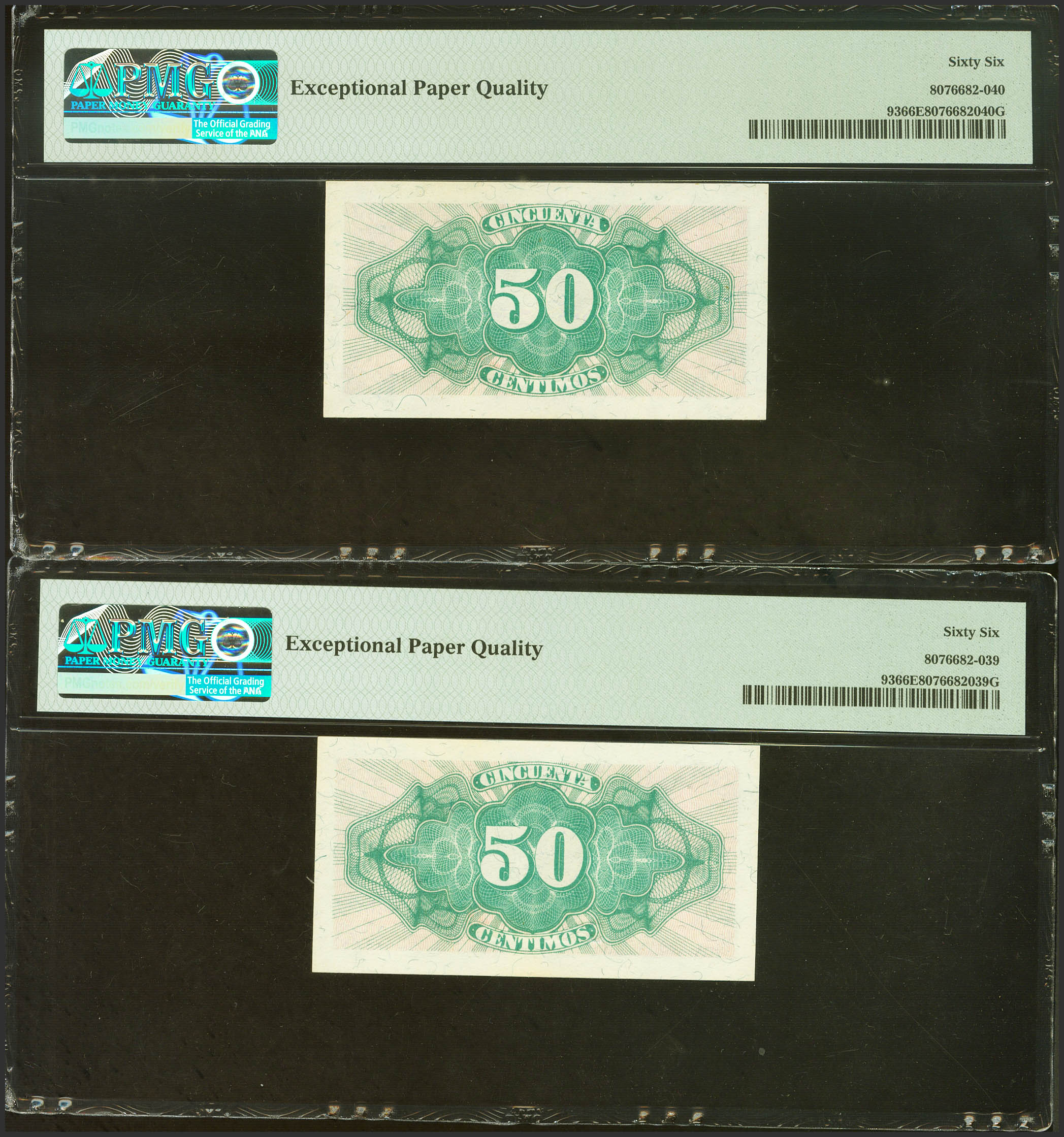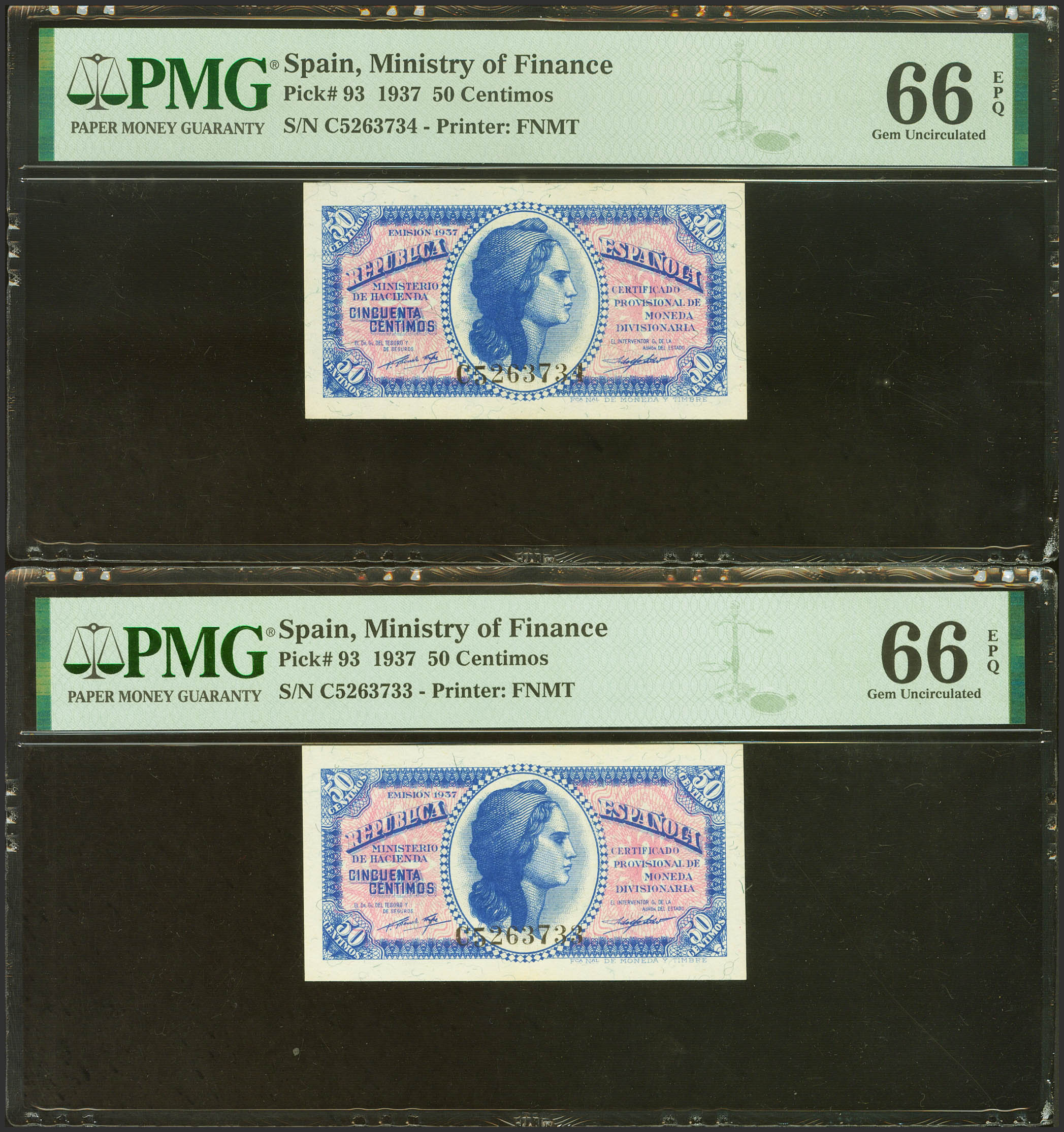 50 Cents. 1937. Ministry of Finance. Correlative couple. Series C, last series issued. (Edifil 2023: 391a, Pick: 93). Unusual in this exceptional quality, original sizing. Uncirculated. PMG66EPQ packages, both.