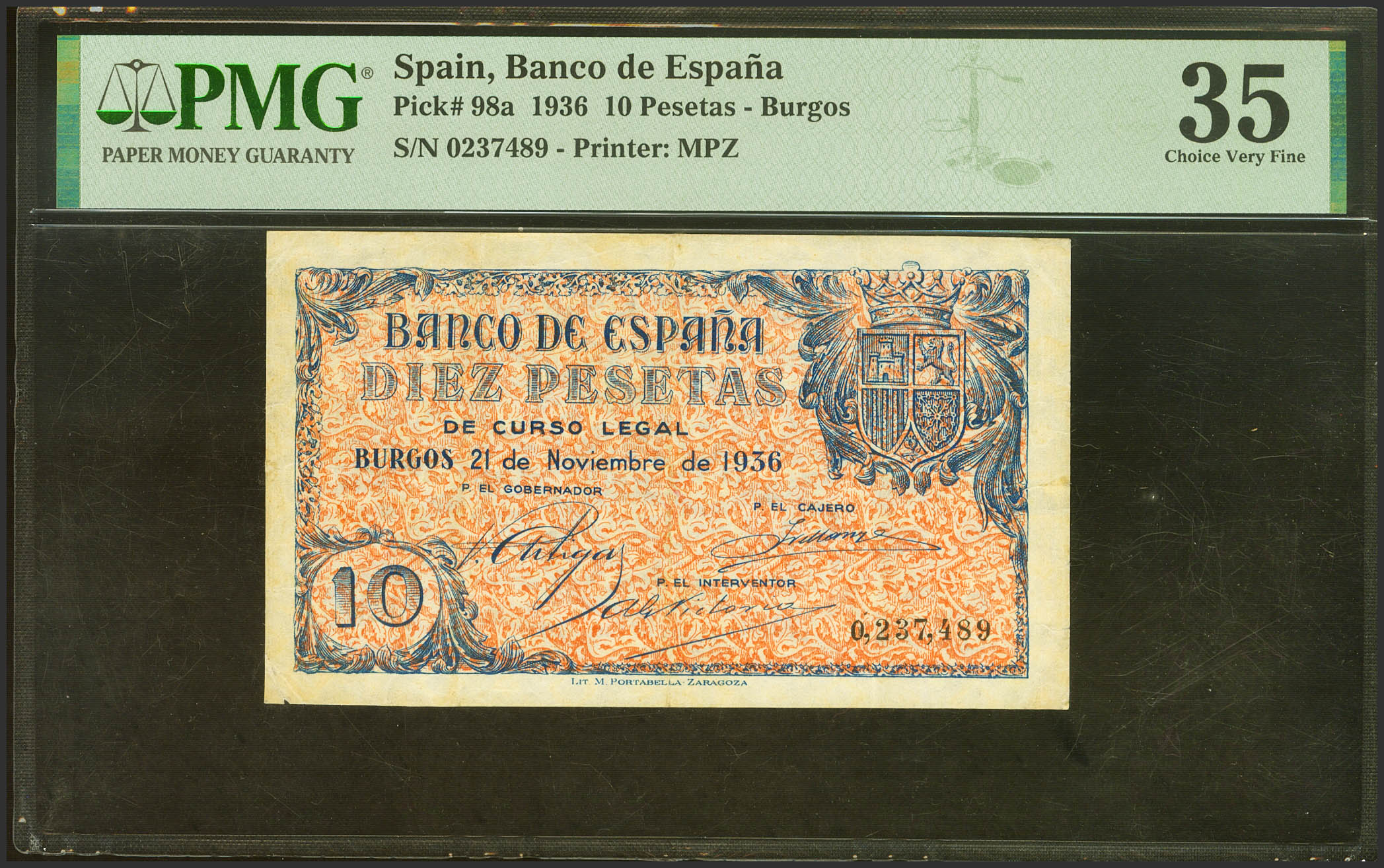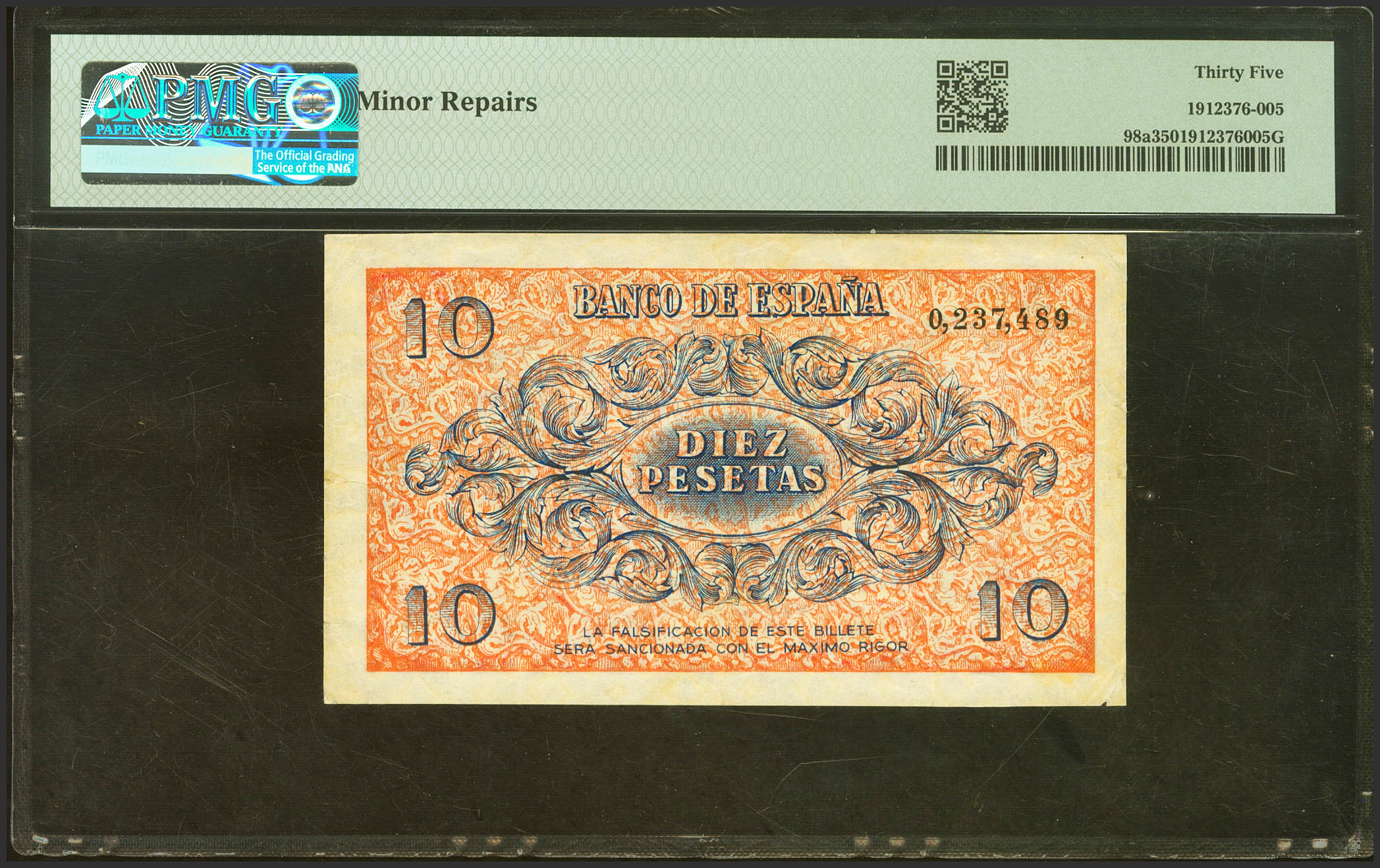 10 Pesetas. November 21, 1936. No series. (Edifil 2023: 418, Pick: 98a). Unusual, minimally repaired. Good Very Fine. PMG35 encapsulation (minor repairs).