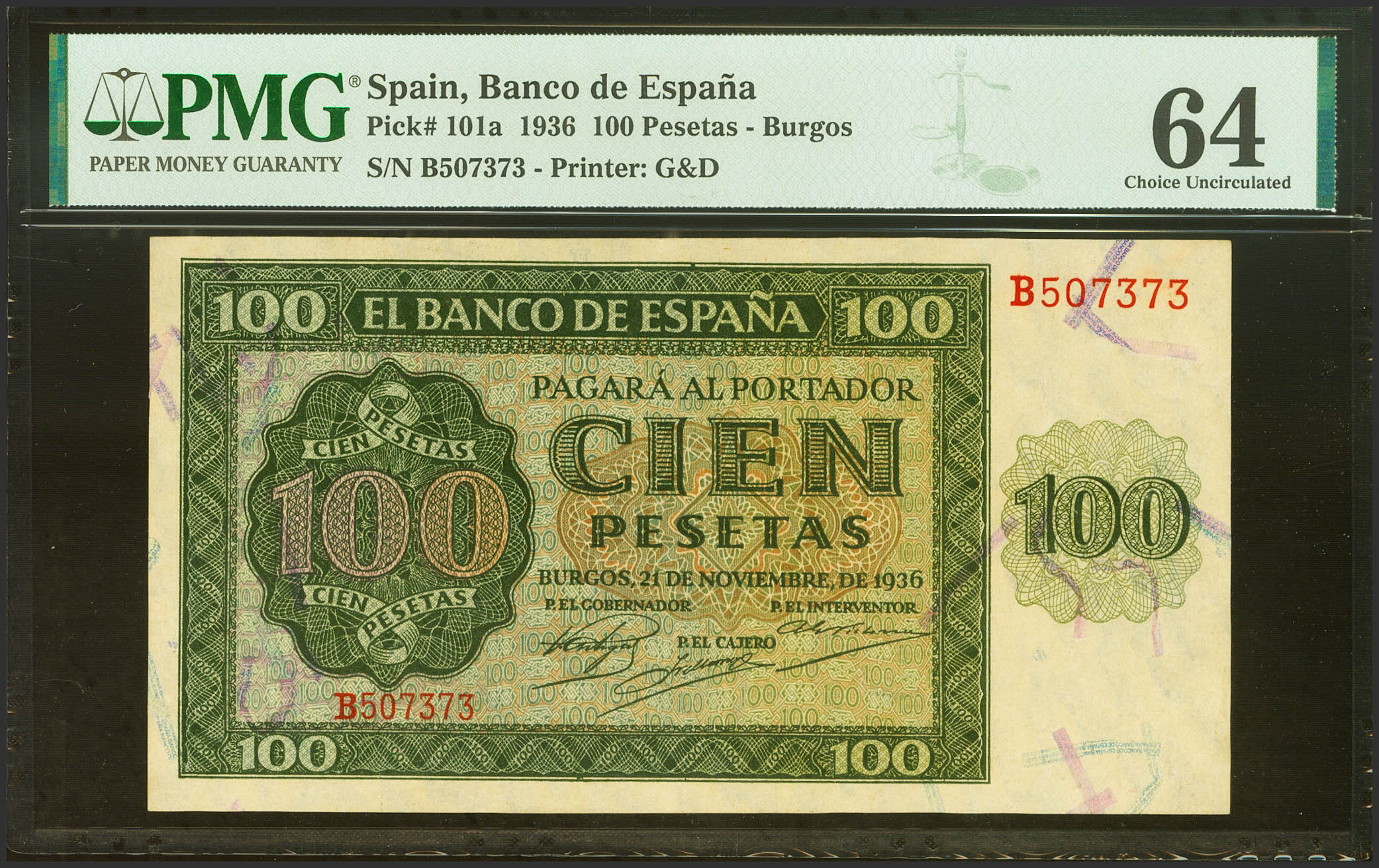 100 Pesetas. November 21, 1936. Series B. (Edifil 2023: 421a, Pick: 101a). Uncirculated. PMG64 encapsulation.