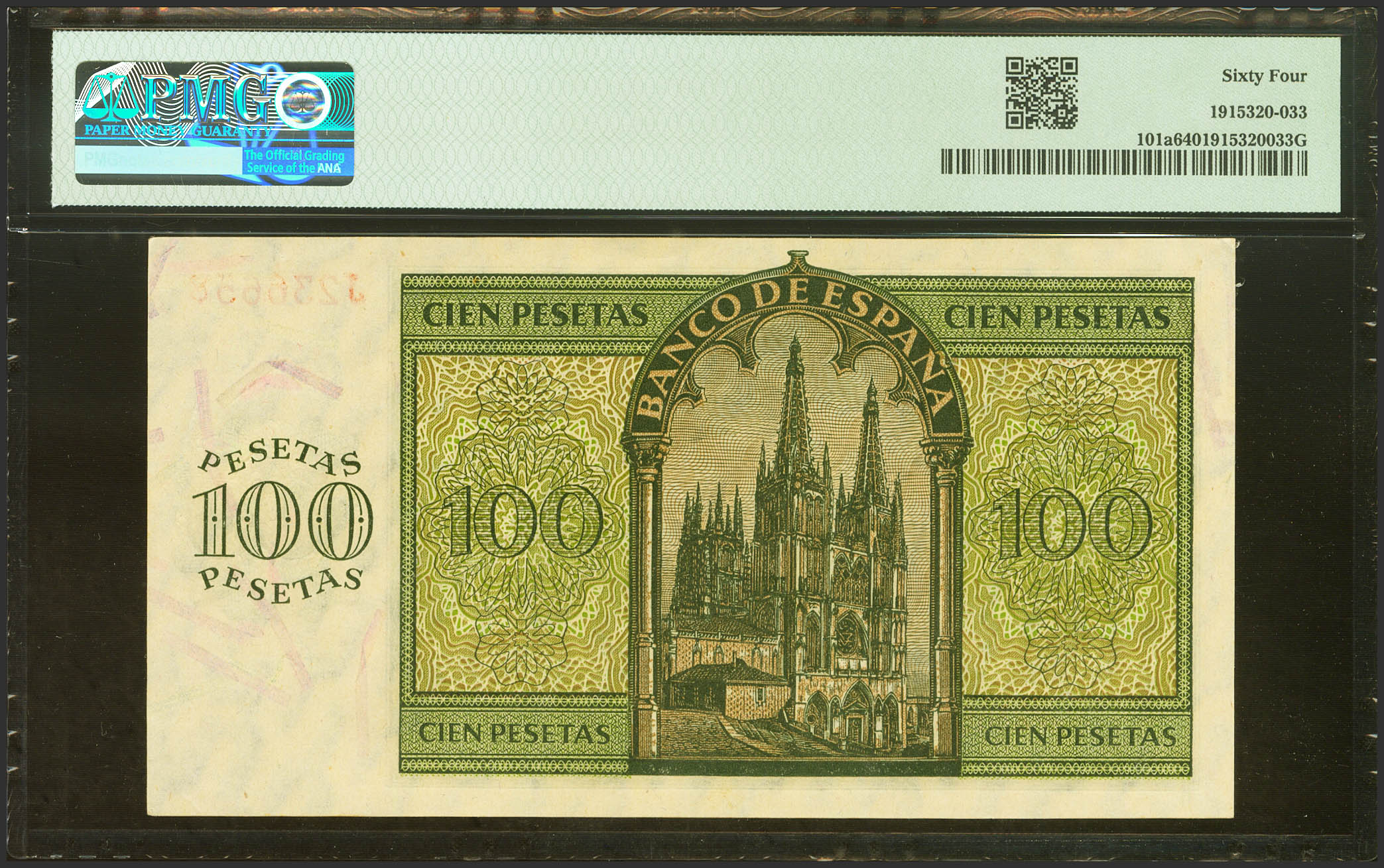 English 100 Pesetas. November 21, 1936. Series J. (Edifil 2023: 421a, Pick: 101a). Uncirculated. PMG64 encapsulation.