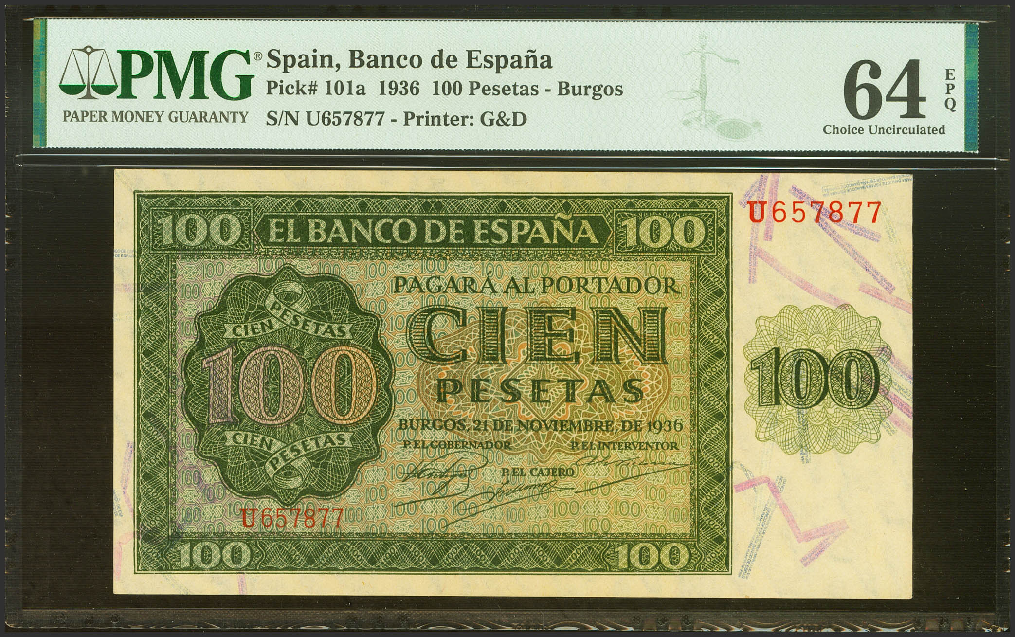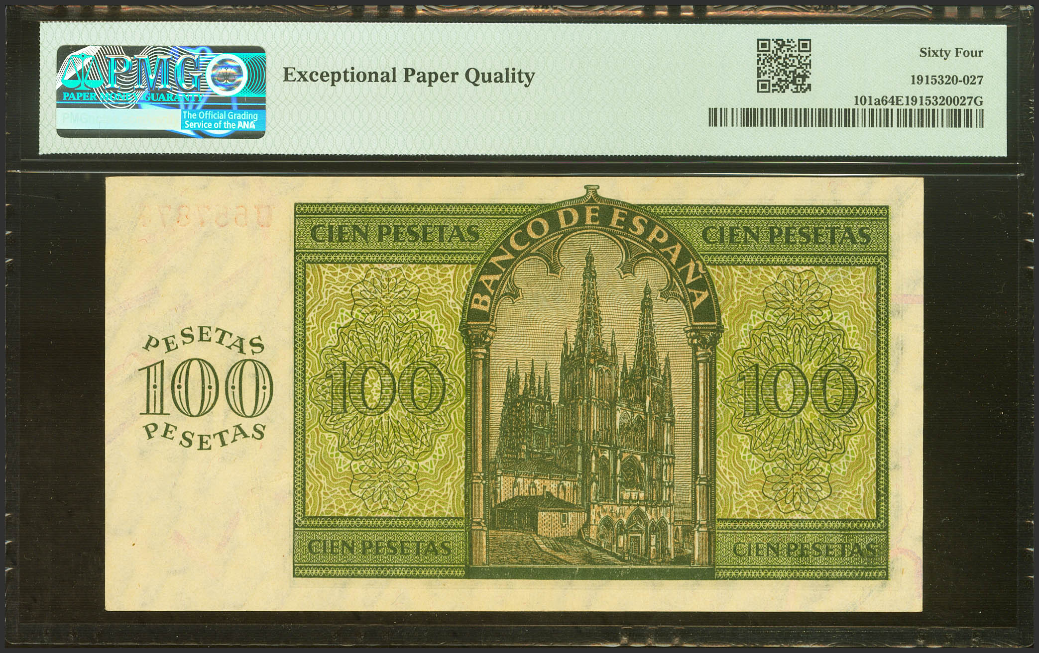 100 Pesetas. November 21, 1936. Series U. (Edifil 2023: 421a, Pick: 101a). Original sizing. Uncirculated. PMG64EPQ package.