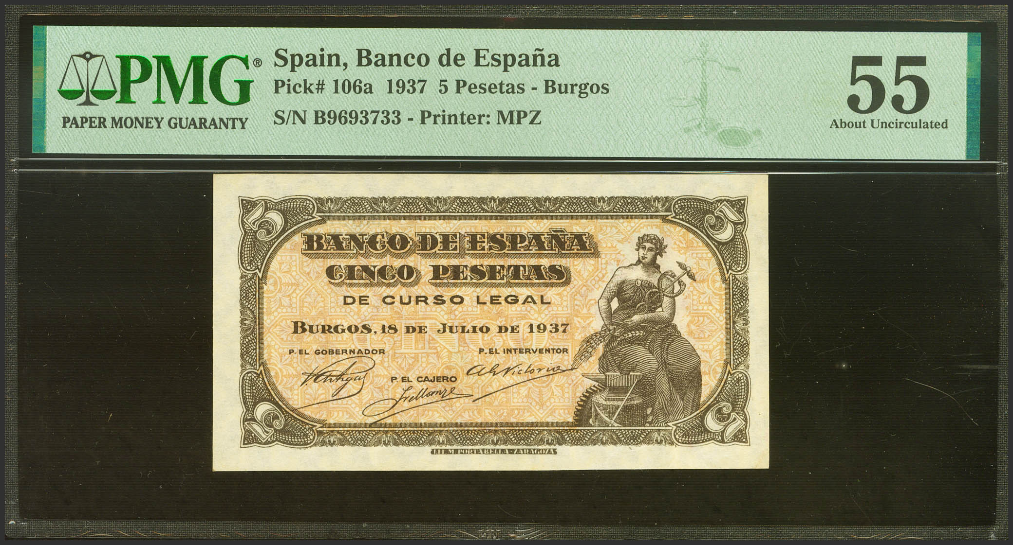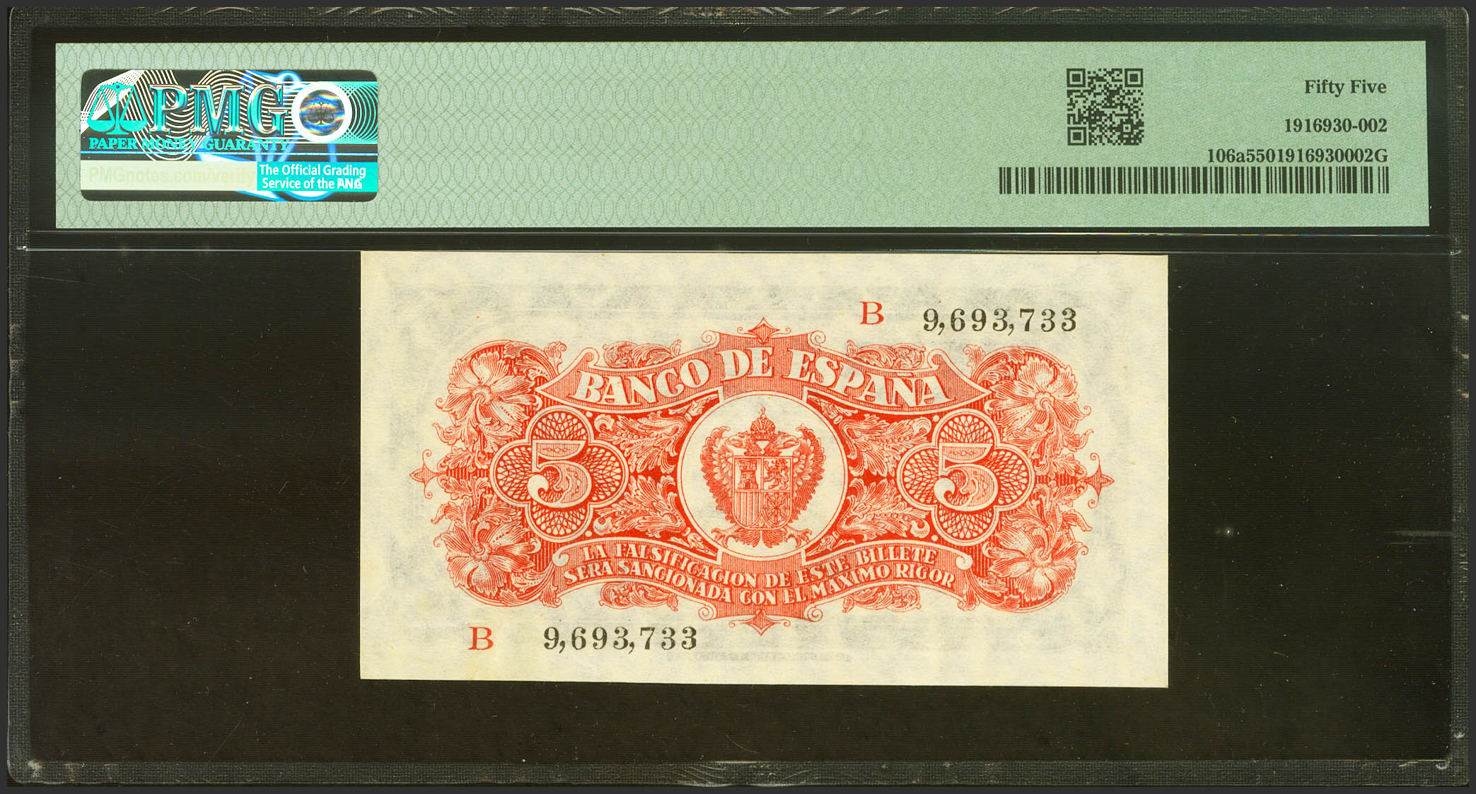 5 Pesetas. July 18, 1937. Series B. (Edifil 2023: 424a, Pick: 106a). Good Extremely Fine. PMG55 encapsulation.