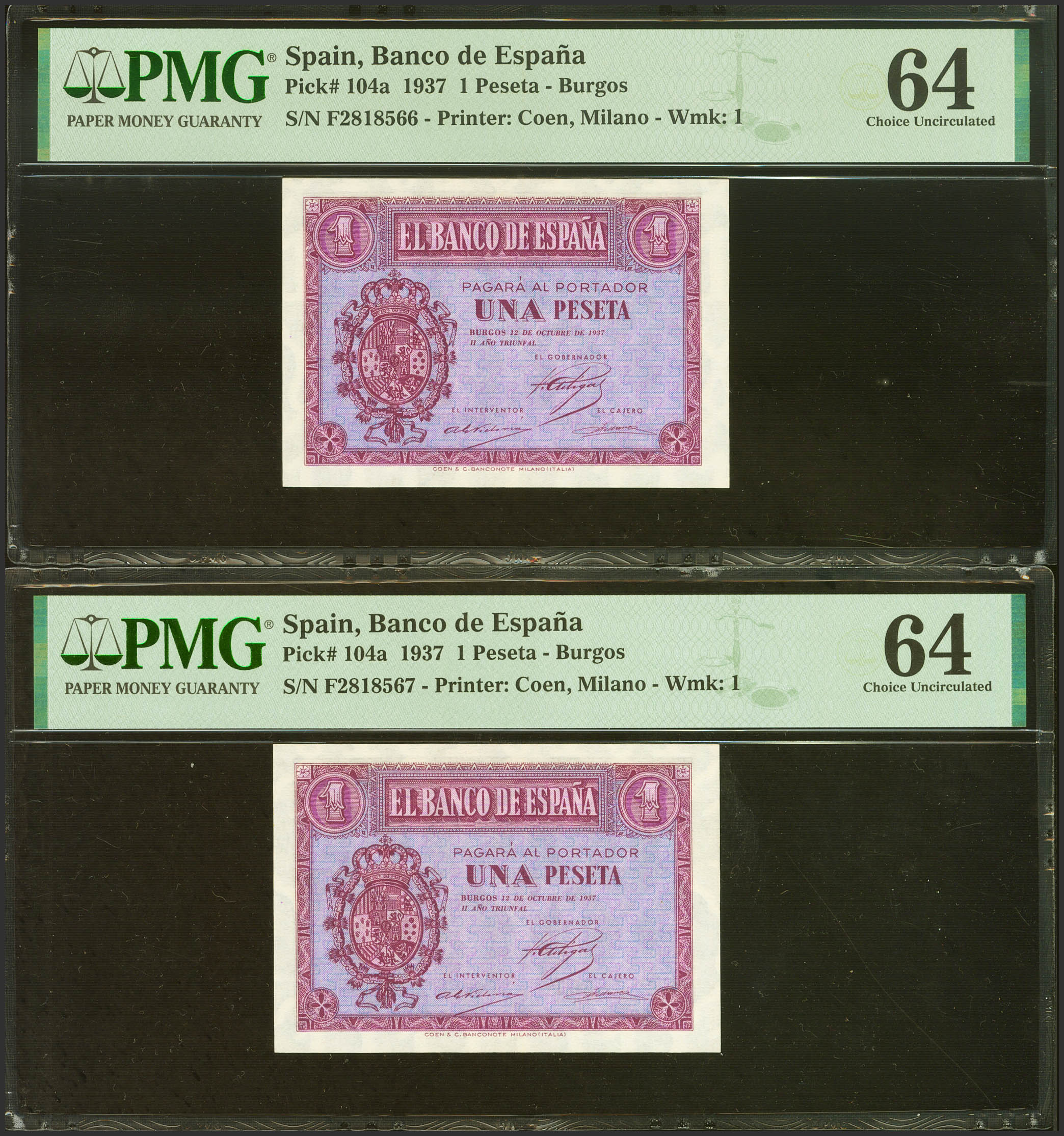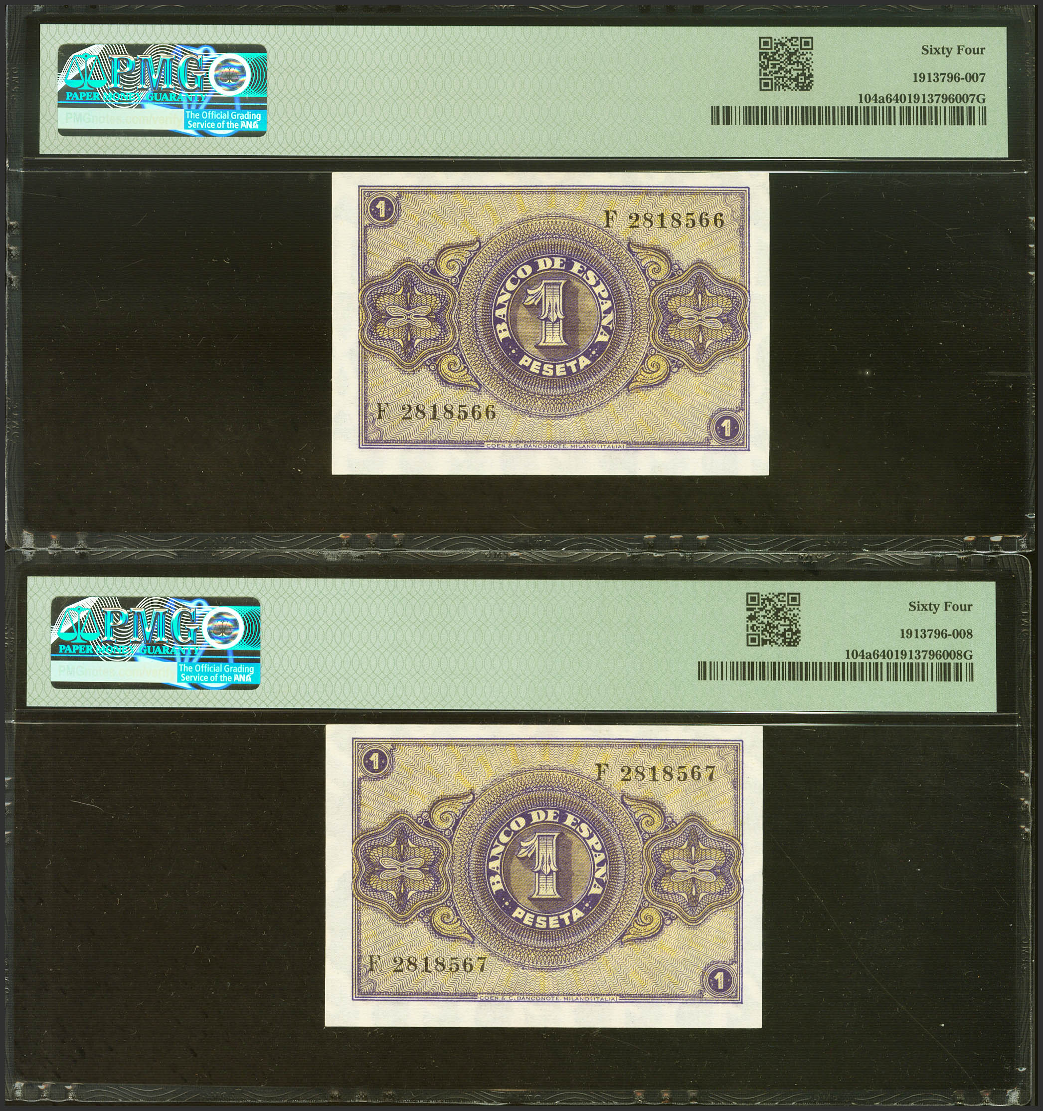 English 1 Peseta. October 12, 1937. Correlative couple. Series F, last series issued. (Edifil 2023: 425b, Pick: 104a). Uncirculated. PMG64 encapsulated, both.