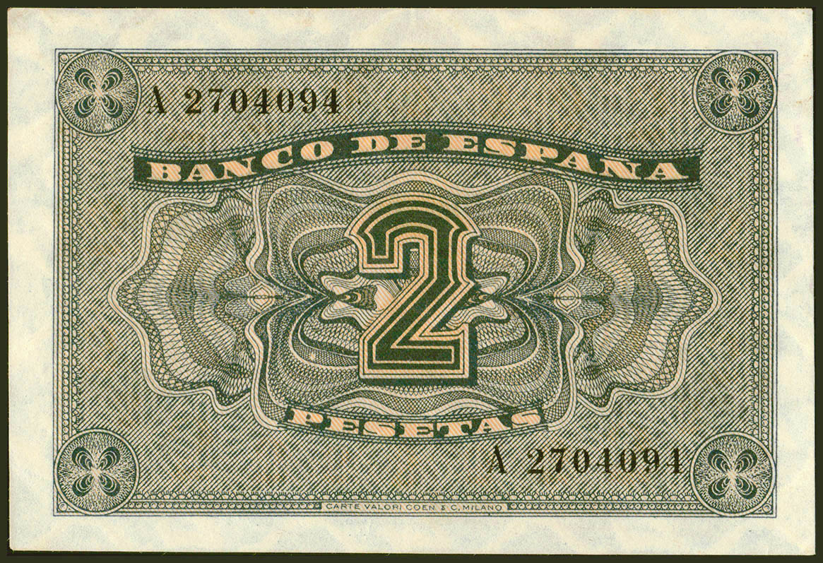 English 2 Pesetas. October 12, 1937. Series A. (Edifil 2021: 426). Unusual in this quality. Almost Uncirculated-.
