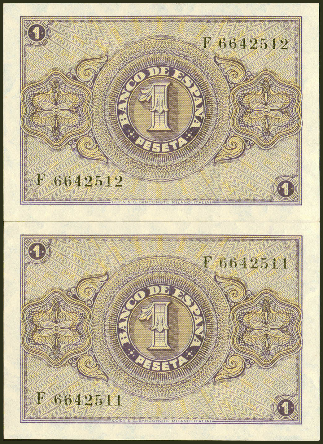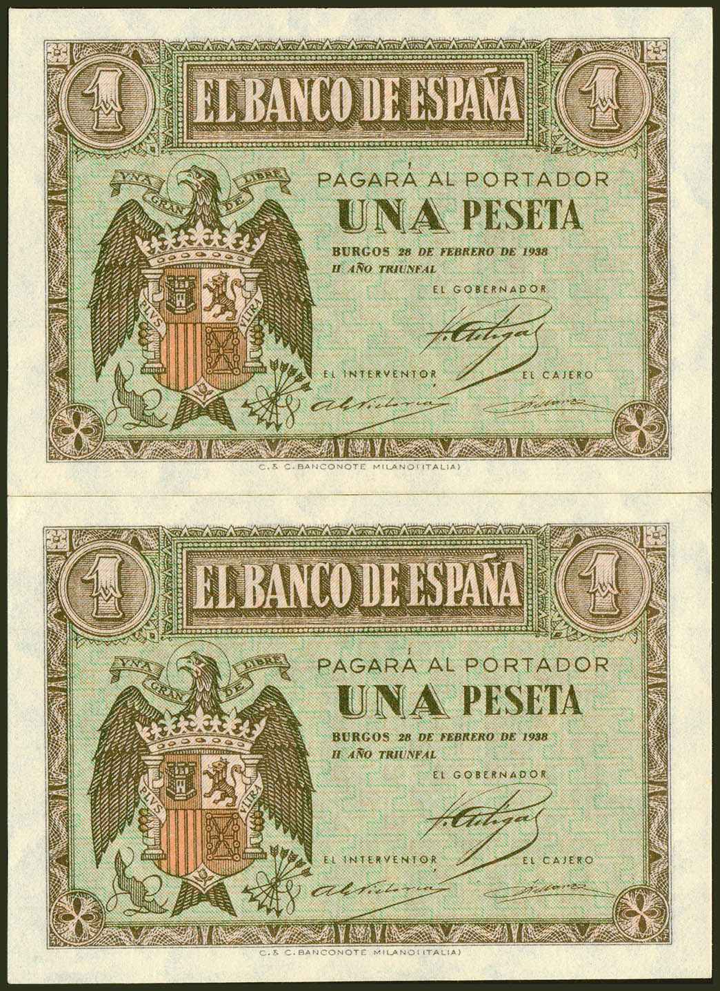1 Peseta. February 28, 1938. Correlative pair. Series F. (Edifil 2021: 427a). It retains all its original finish. Uncirculated/ Almost Uncirculated.