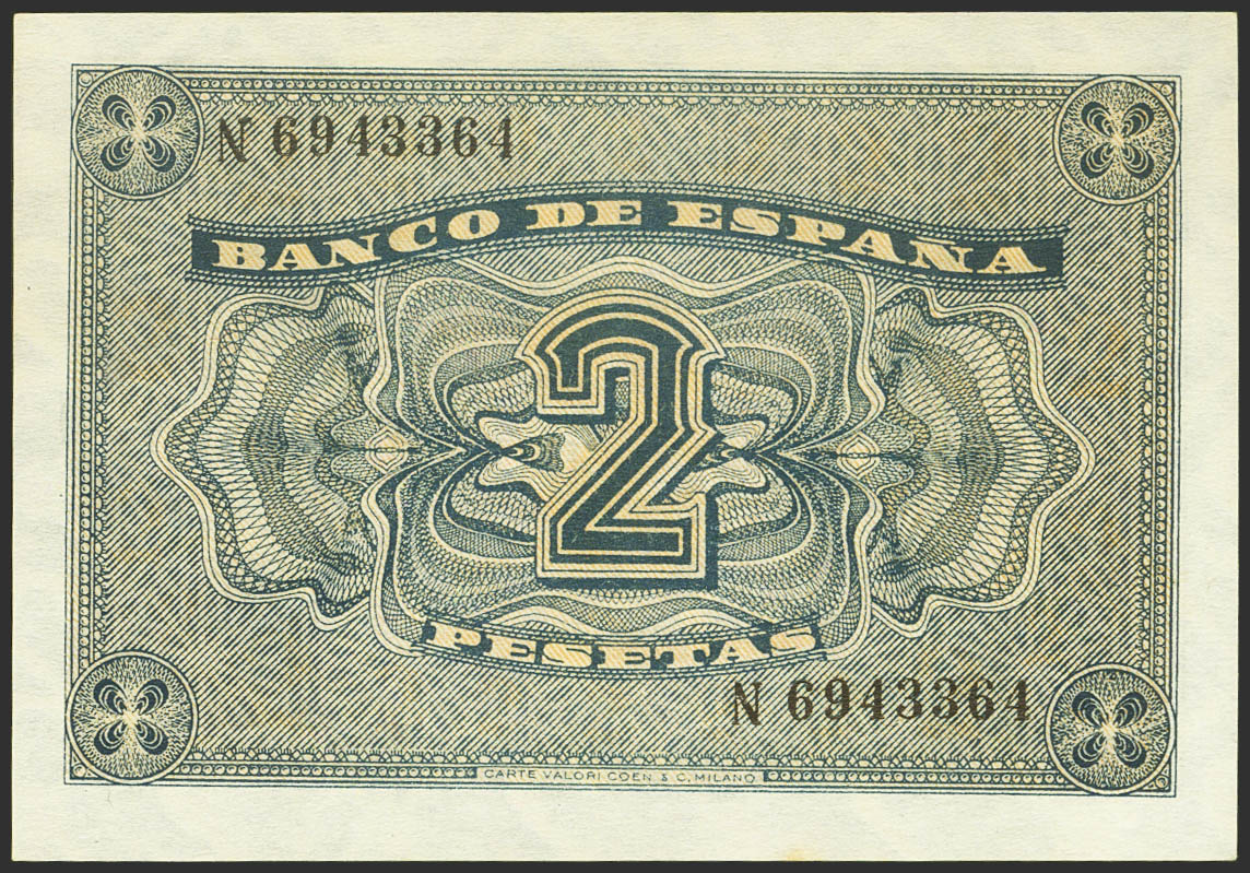 English 2 Pesetas. April 30, 1938. Series N, last series issued. (Edifil 2023: 429b). Original sizing. Uncirculated.