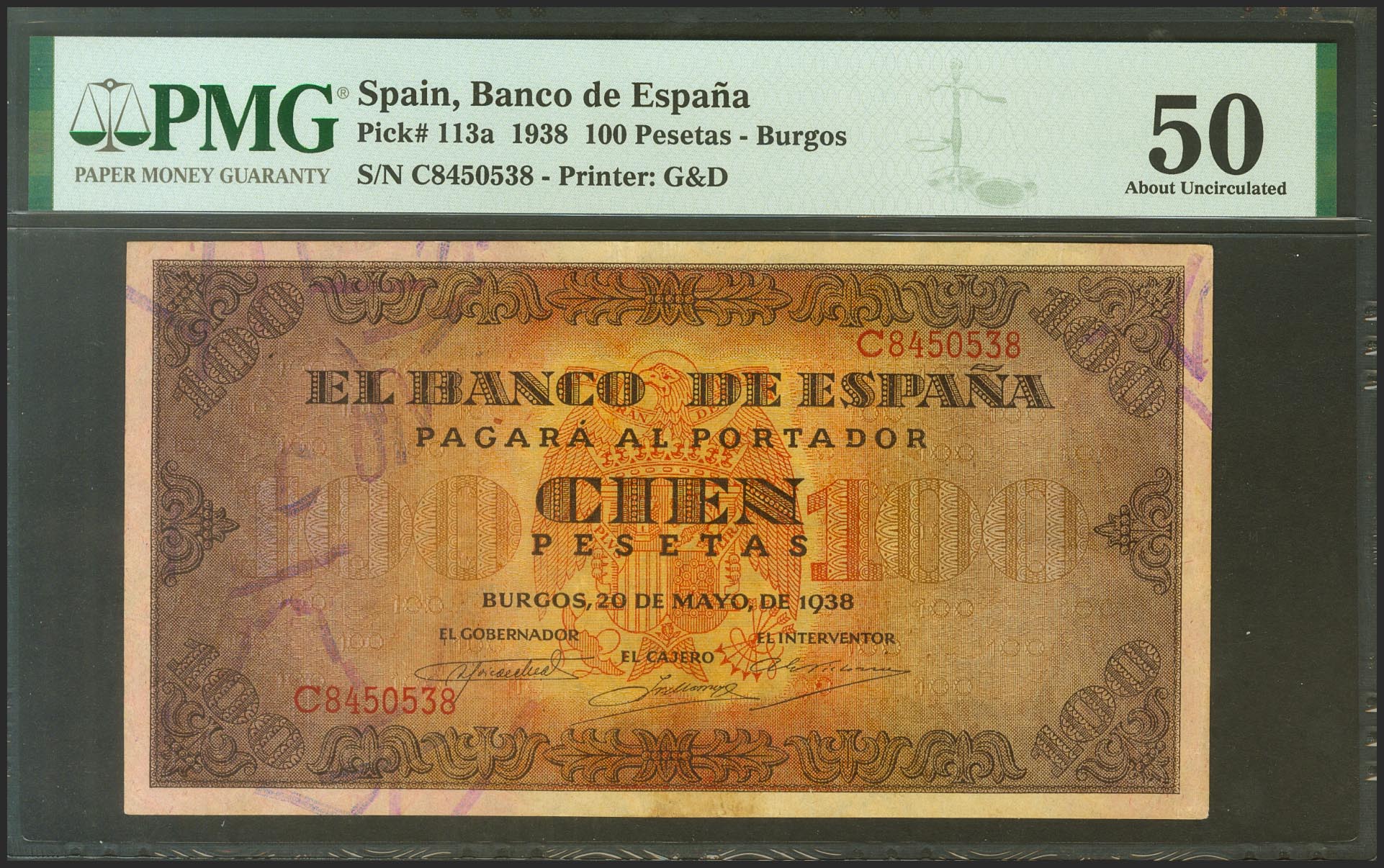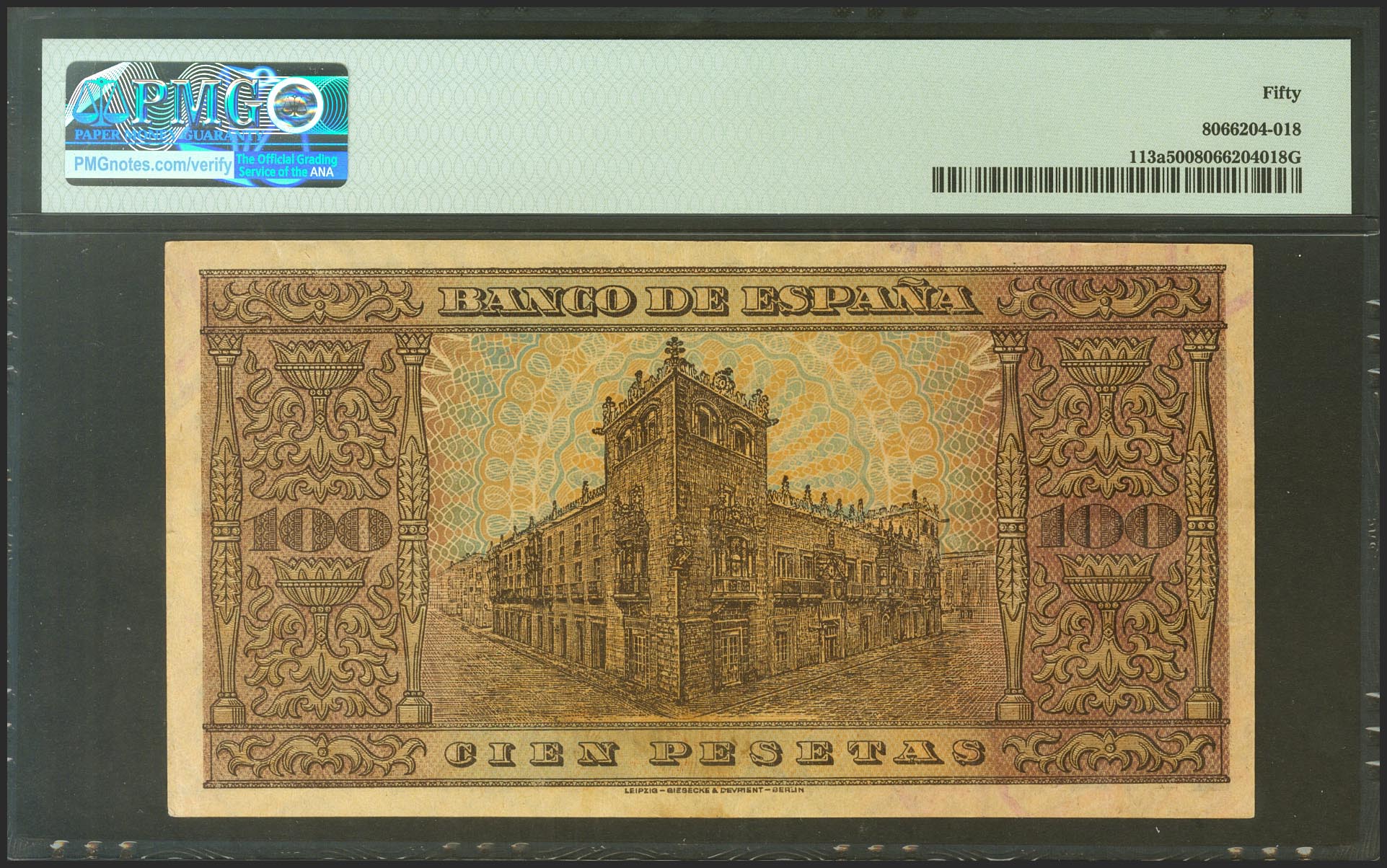 100 Pesetas. May 20, 1938. Series C. (Edifil 2021: 432a, Pick: 113a). Good Extremely Fine. PMG50 encapsulation.