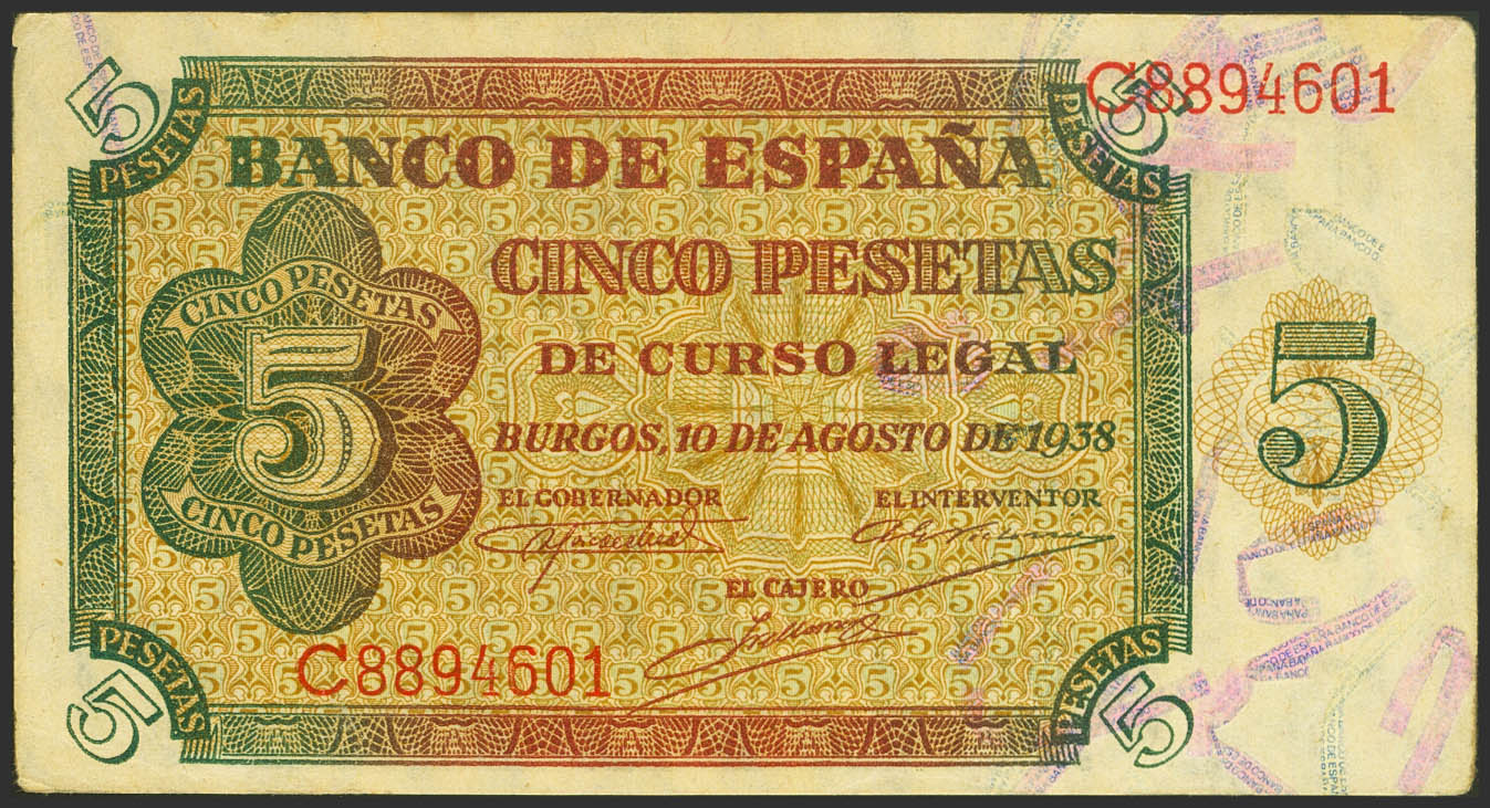 5 Pesetas. August 10, 1938. Series C. (Edifil 2021: 435a). Original sizing. EBC+++.