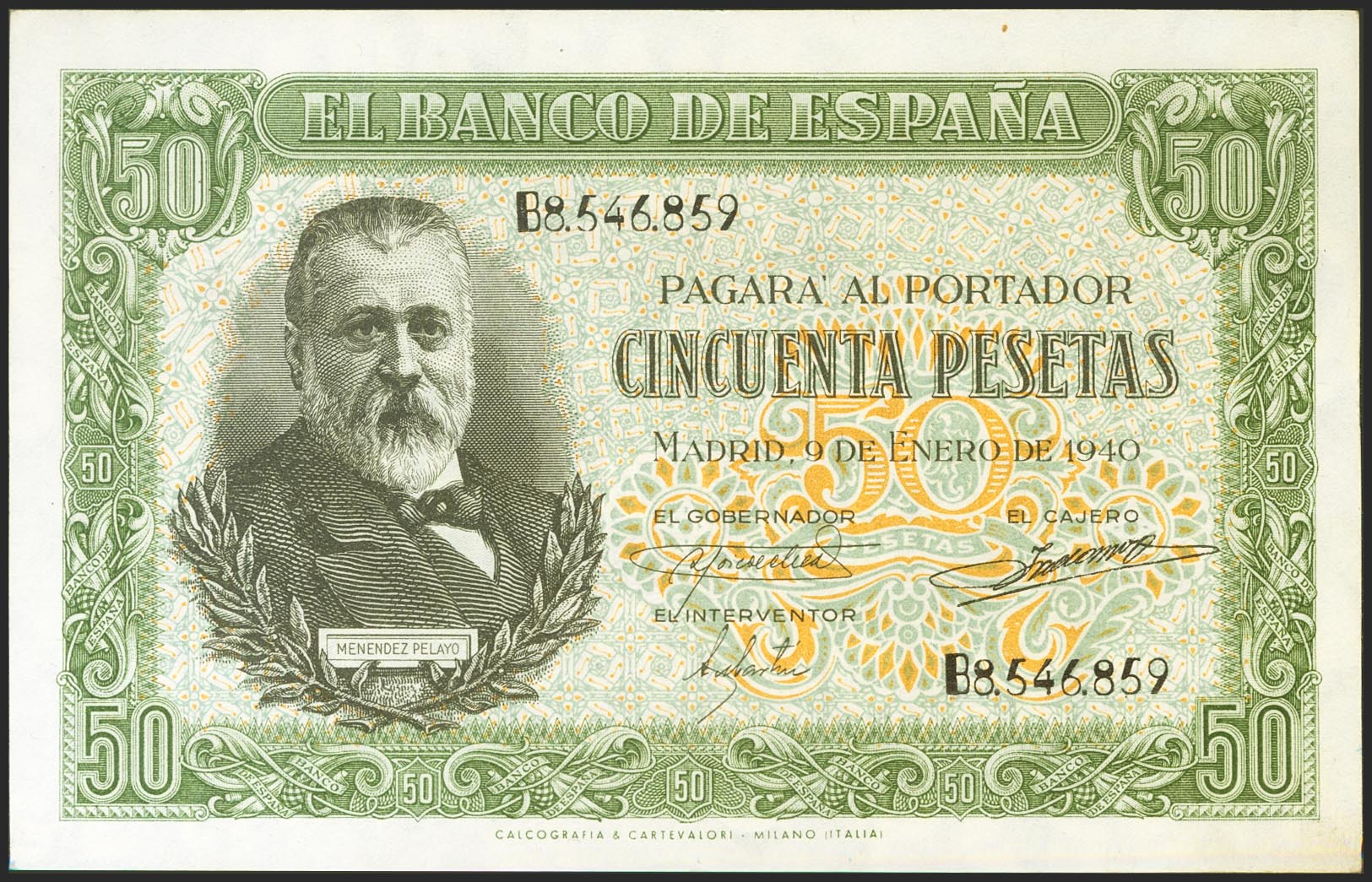 English 50 Pesetas. January 9, 1940. Series B. (Edifil 2021: 437a, Pick: 117a). Unusual in this quality, original sizing. Almost Uncirculated.