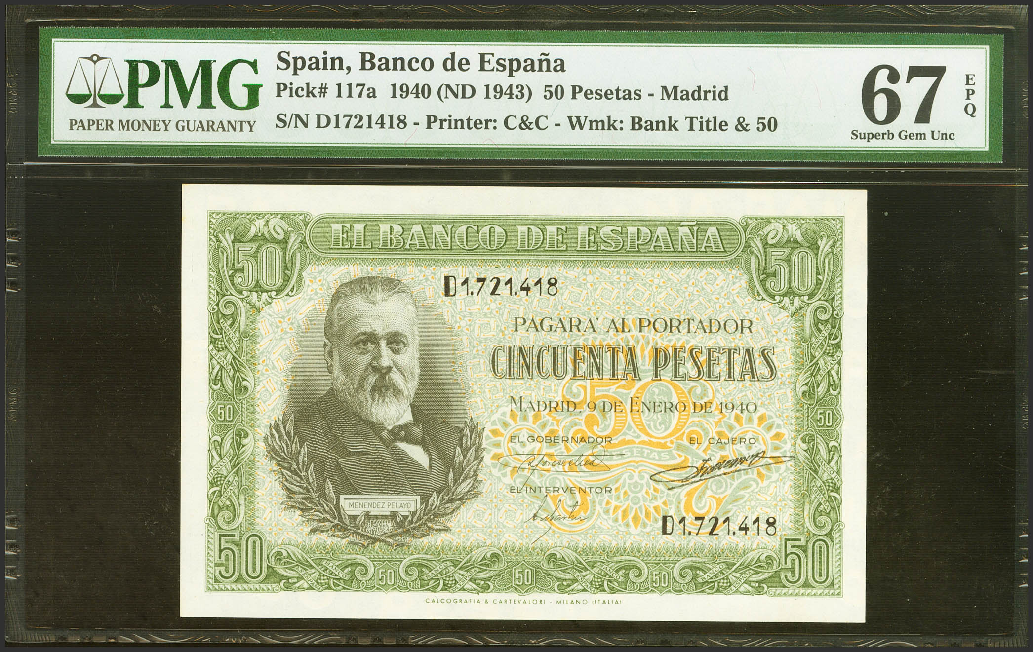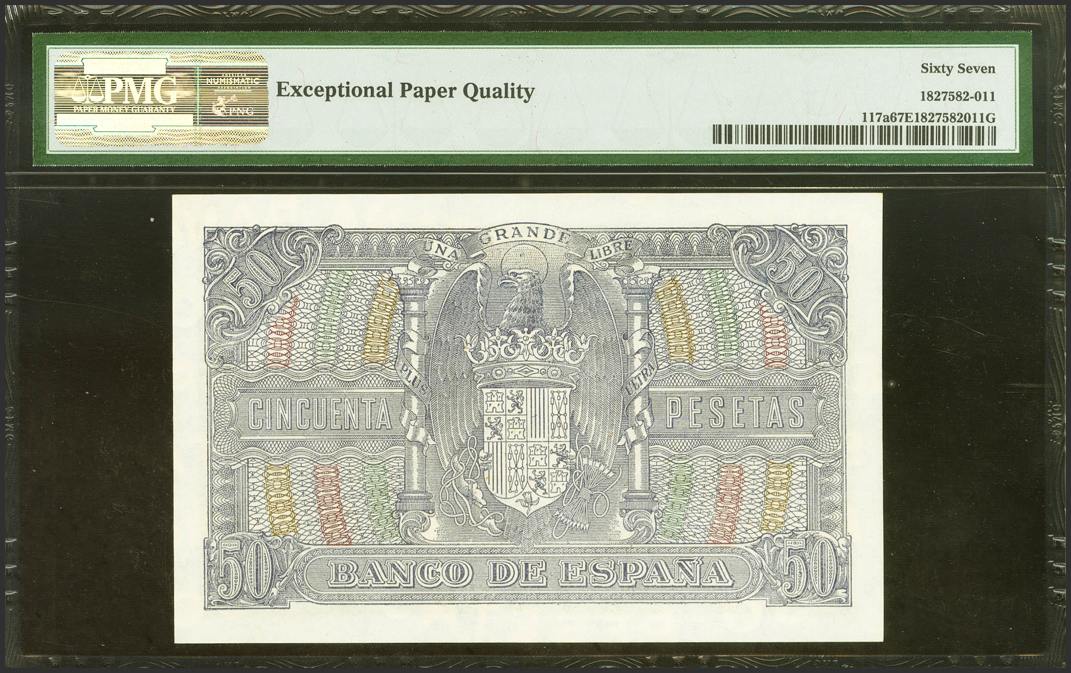 50 Pesetas. January 9, 1940. Series D. (Edifil 2023: 437a, Pick: 117a). Rare in this exceptional quality, original sizing. PMG67EPQ package.