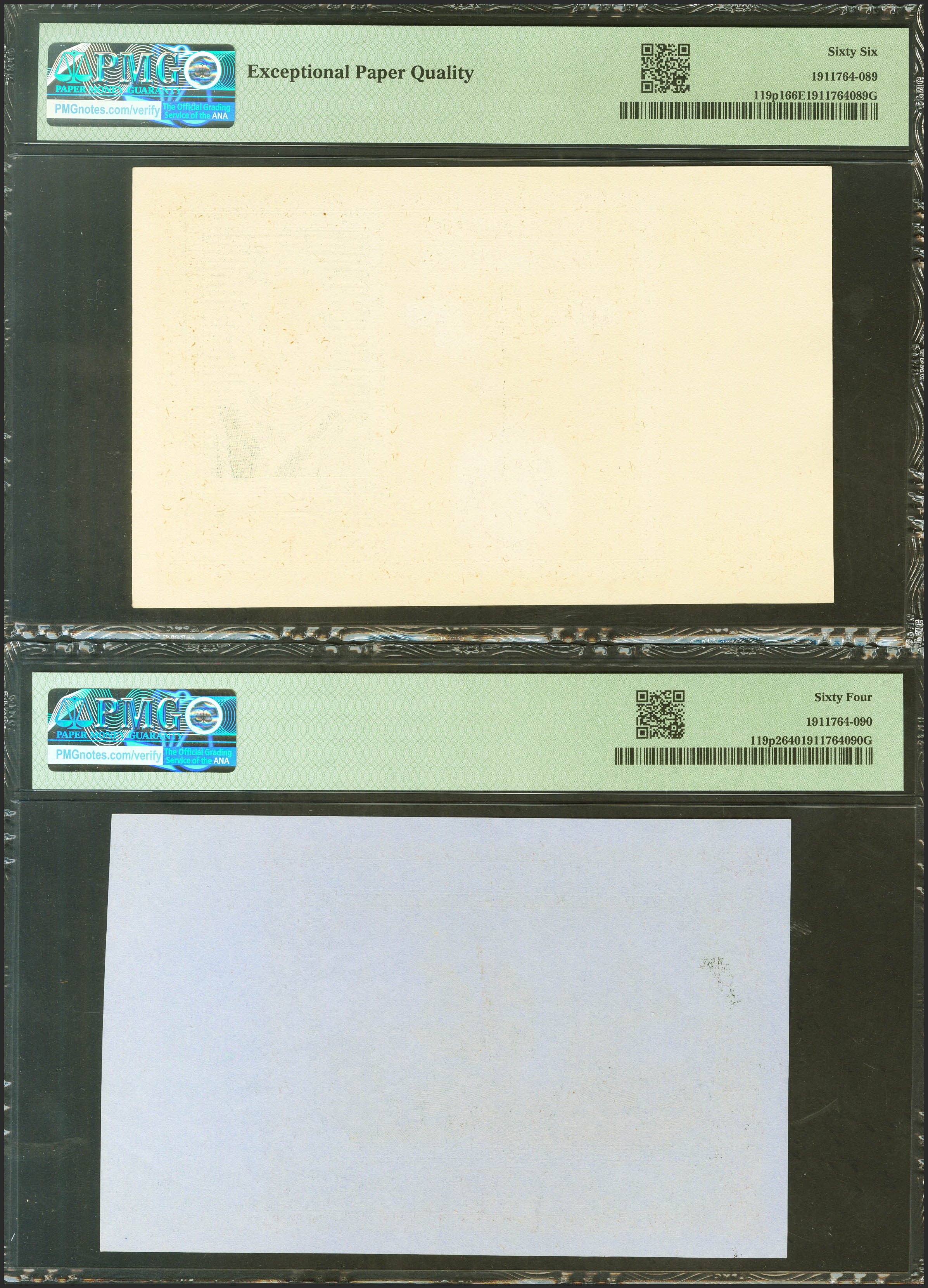 Set of tests on the front and back of the 500 Pesetas bill issued on January 9, 1940, the front side without numbering and without the cashier's signature. (Edifil 2021: 439Pa, 439Pb, Pick: 119p1, 119p2). Very rare and spectacular. Uncirculated. Encapsulated PMG66EPQ/64, respectively.