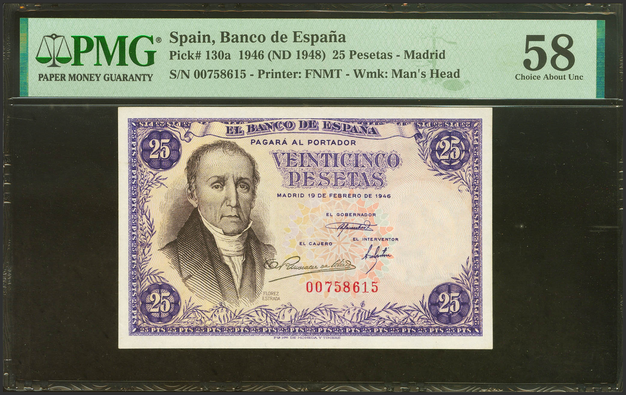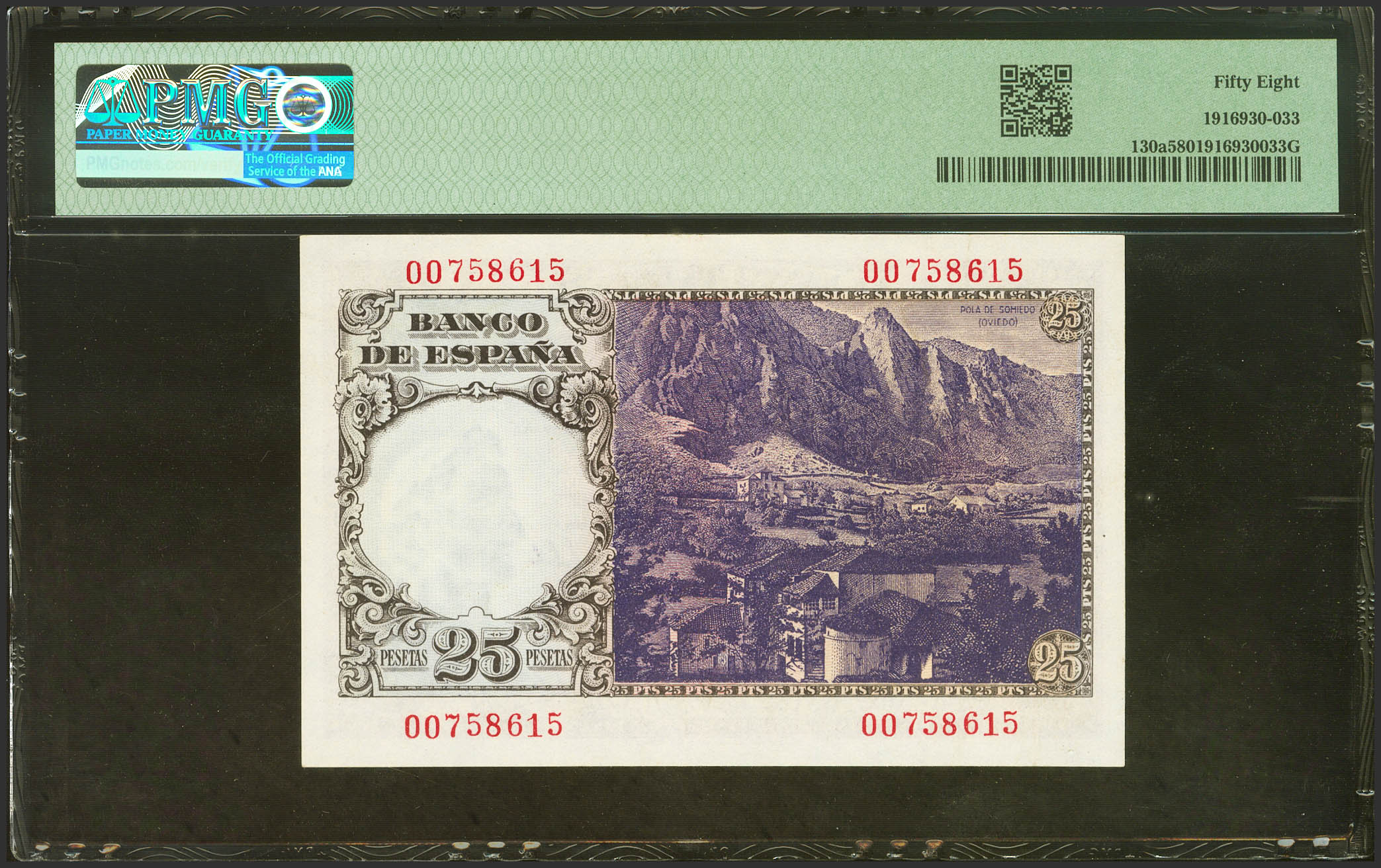 25 Pesetas. February 19, 1946. No series. (Edifil 2023: 450, Pick: 130a). EBC++. PMG58 encapsulation.