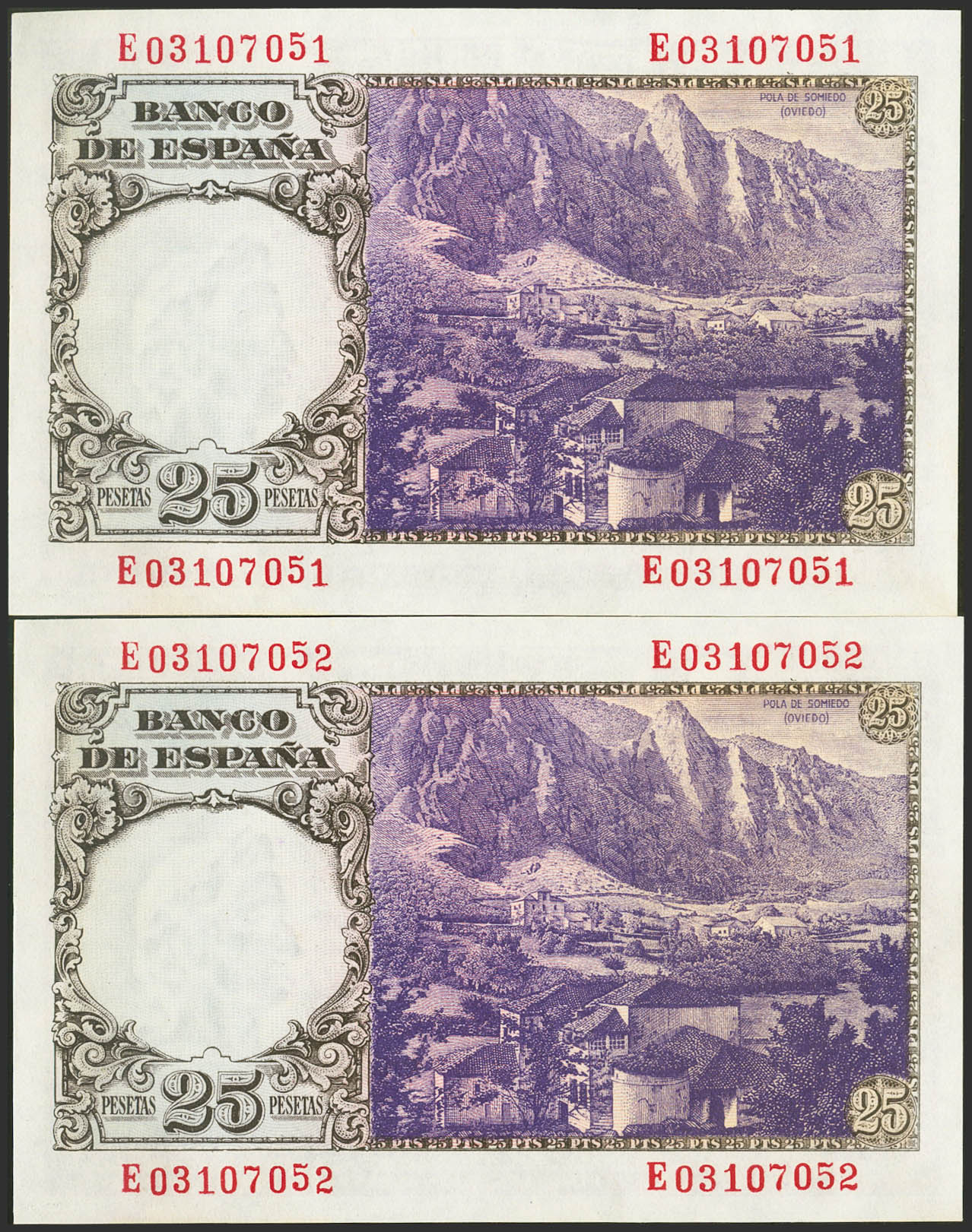 English 25 Pesetas. February 19, 1946. Correlative couple. Series E. (Edifil 2021: 450a). Original sizing. Almost Uncirculated.