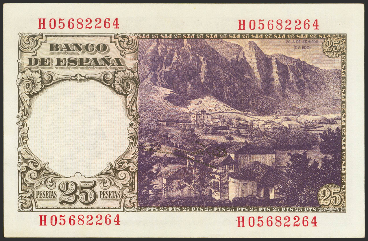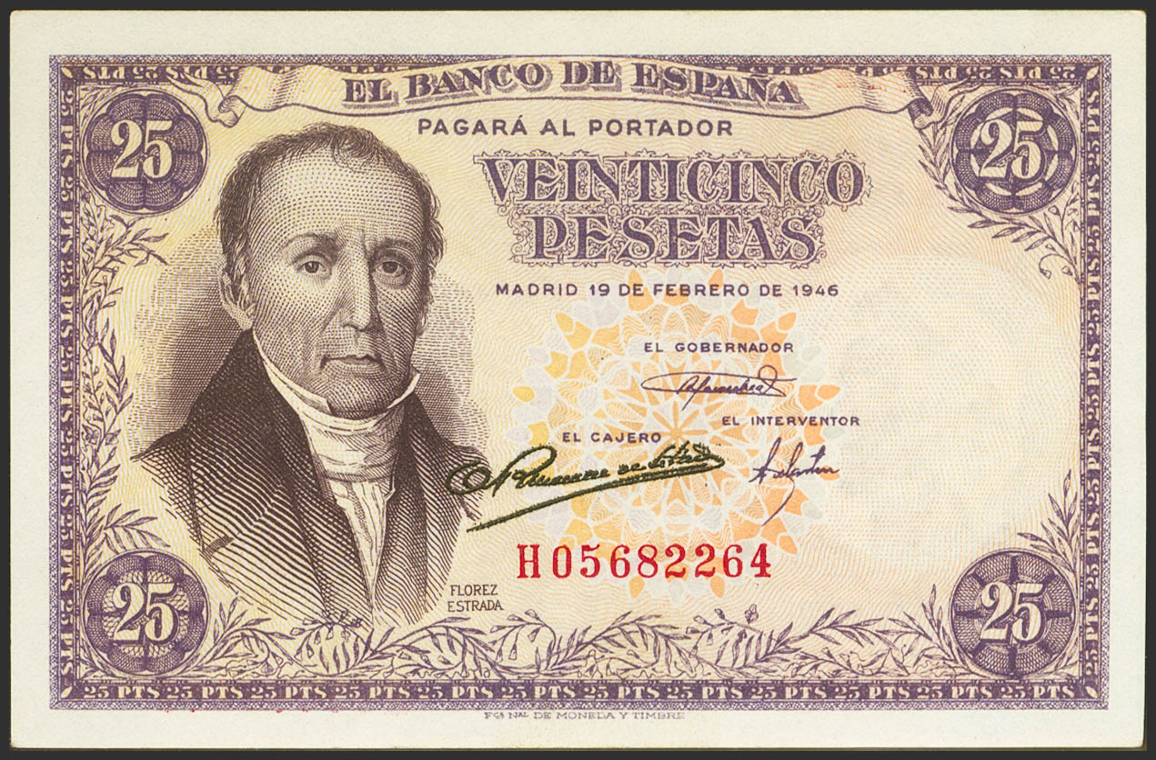 25 Pesetas. February 19, 1946. Series H. (Edifil 2021: 450a). Original sizing. Uncirculated.
