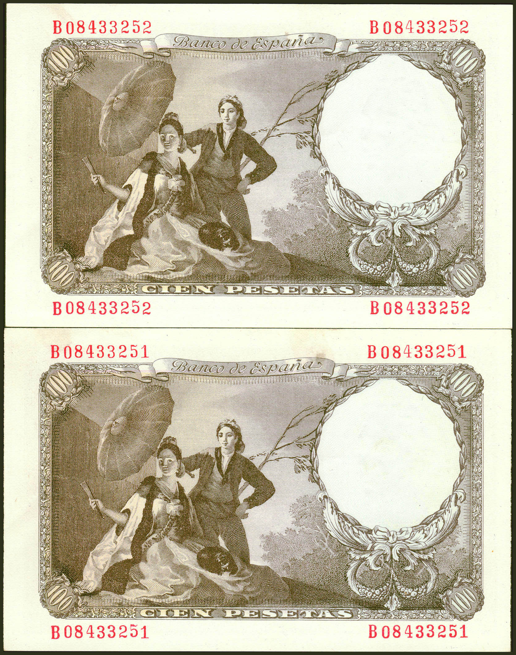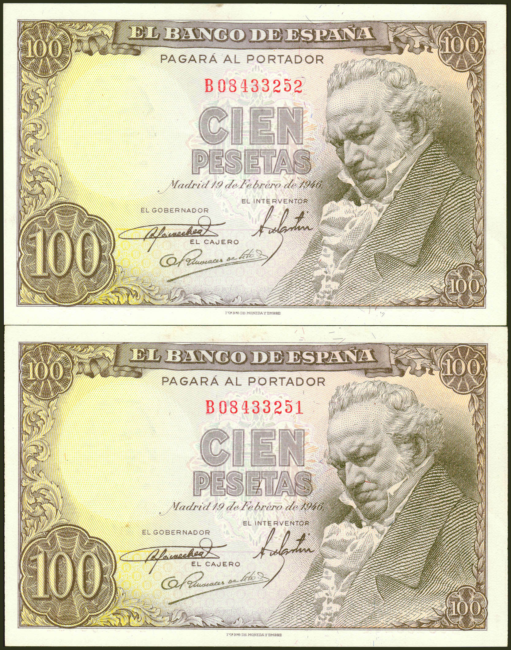 100 Pesetas. February 19, 1946. Correlative couple. Series B. (Edifil 2021: 451b). Original sizing. Almost Uncirculated-.