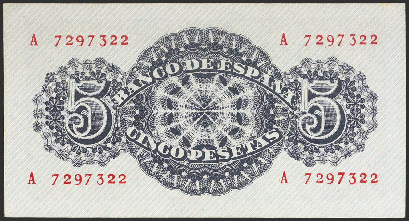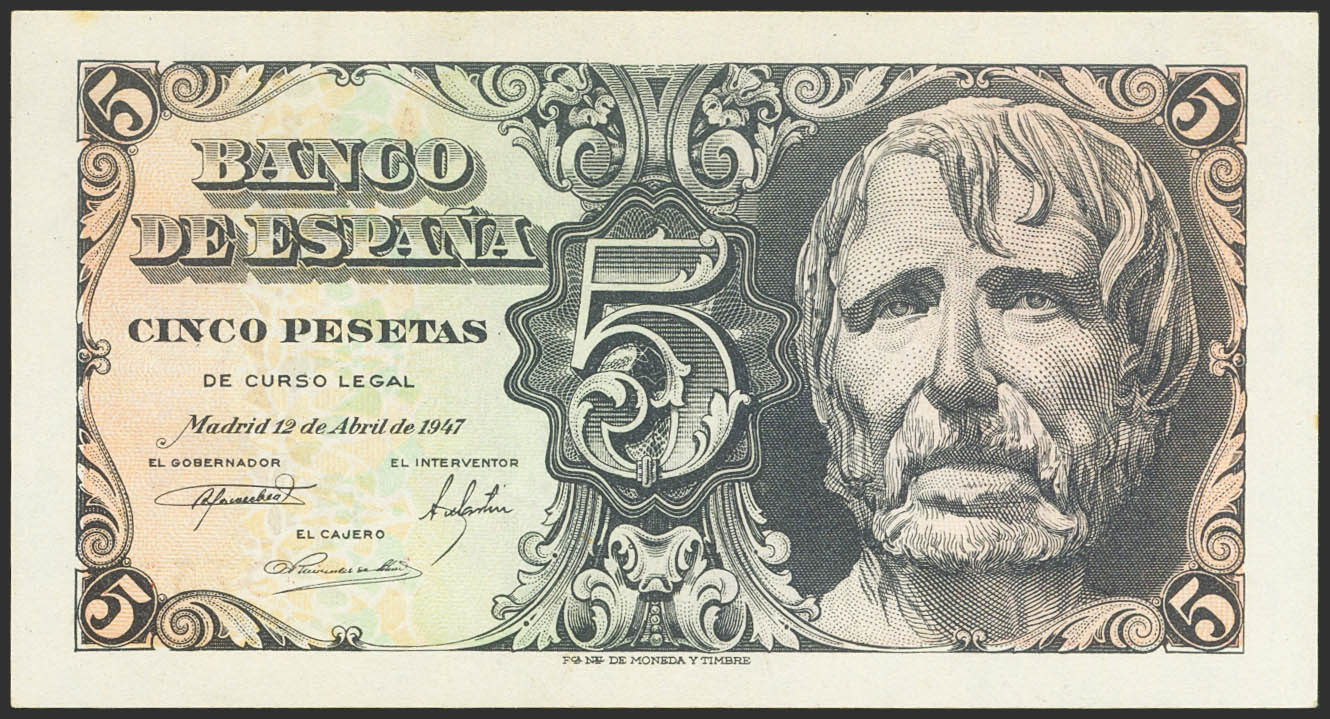 5 Pesetas. April 12, 1947. Series A. (Edifil 2023: 454a). It retains much of its original finish. Good Extremely Fine.