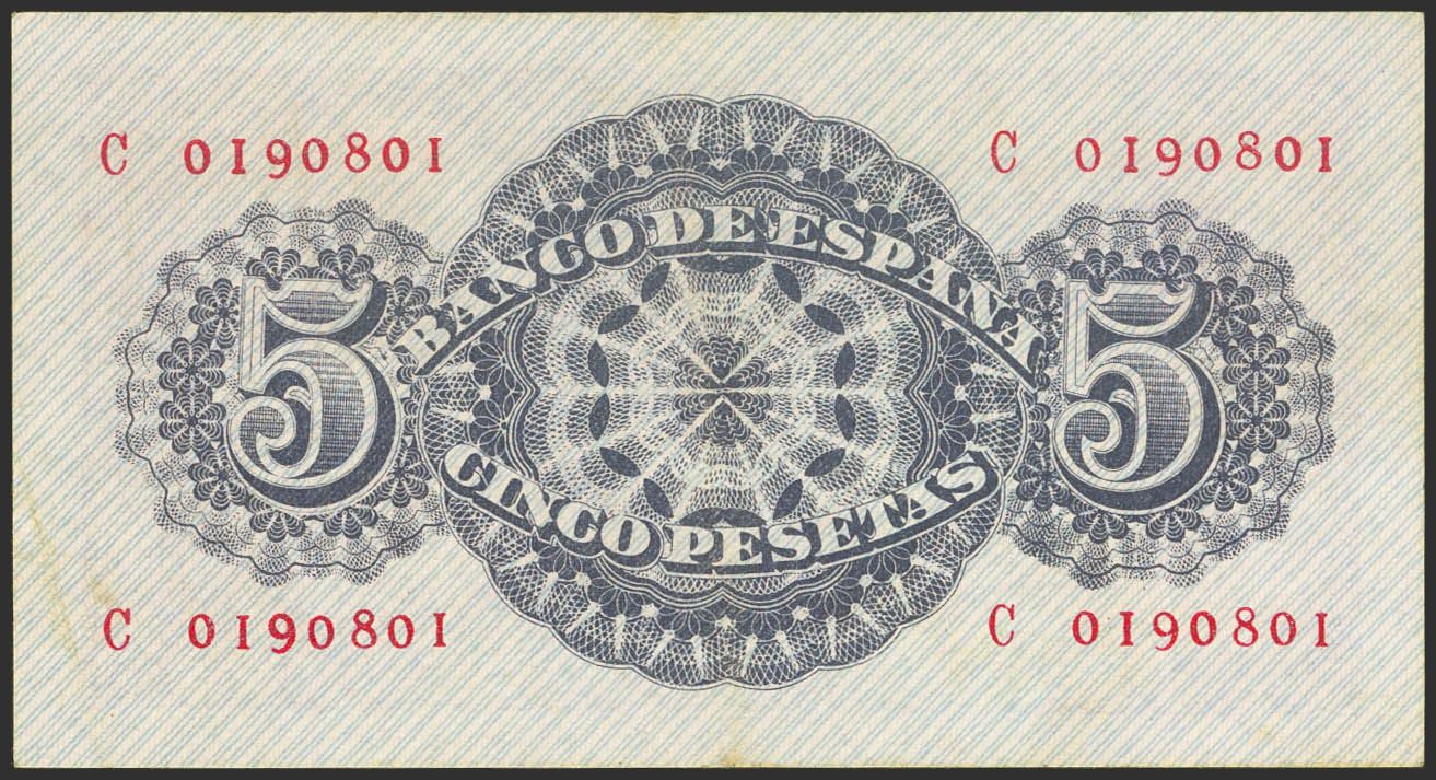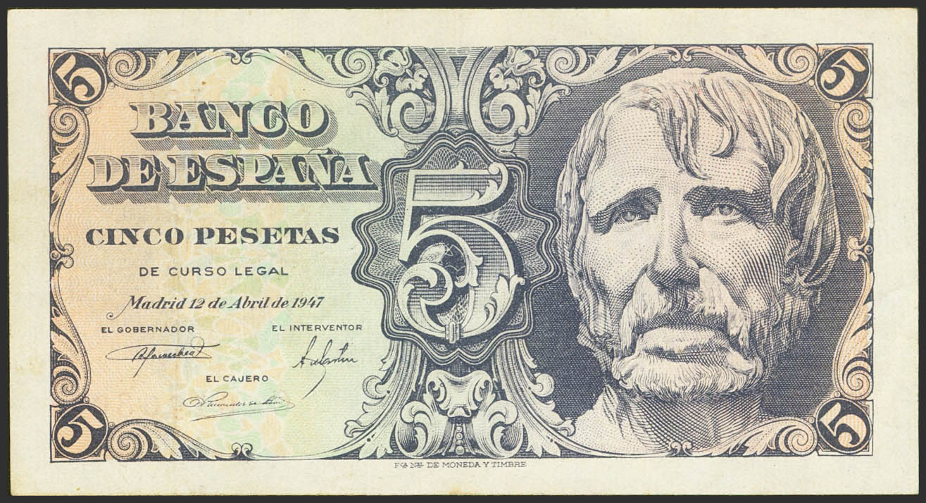 5 Pesetas. April 12, 1947. Series C. (Edifil 2023: 454a). It retains much of its original finish. Good Extremely Fine.