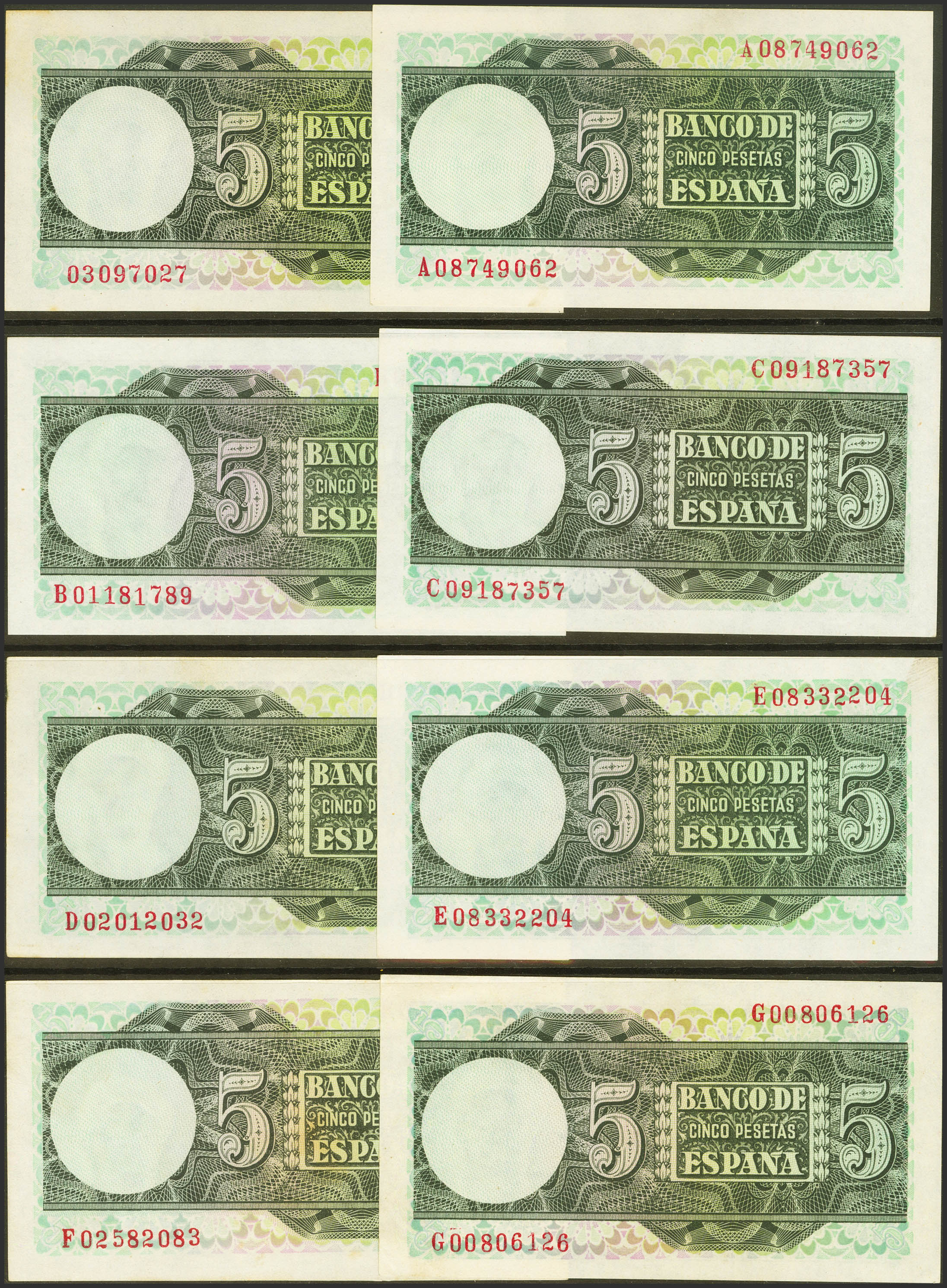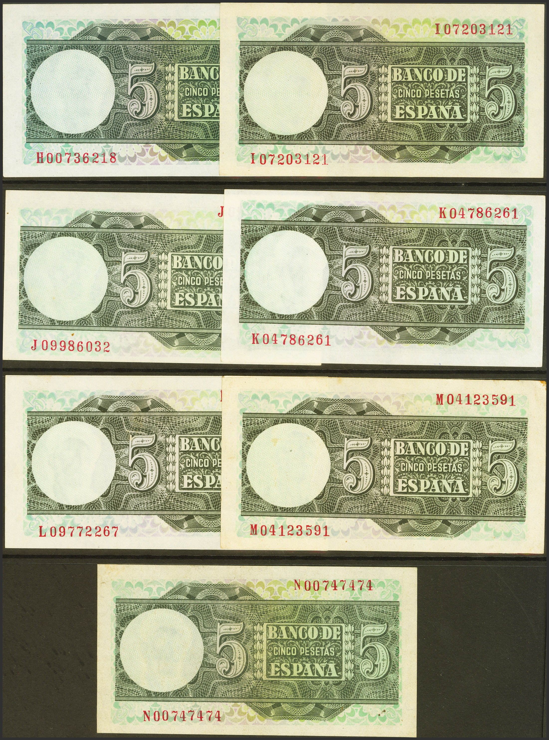 Set of 15 5 Pesetas banknotes issued on March 15, 1948 and corresponding to all known series that include the no series and the series A, B, C, D, E, F, G, H, I, J, K , L, M, N (Edifil 2021: 455, 455a, 455b). Very unusual set that includes all the different series issued including the very rare N series (the N series in Good Extremely Fine conservation). Uncirculated/ Almost Extremely Fine.