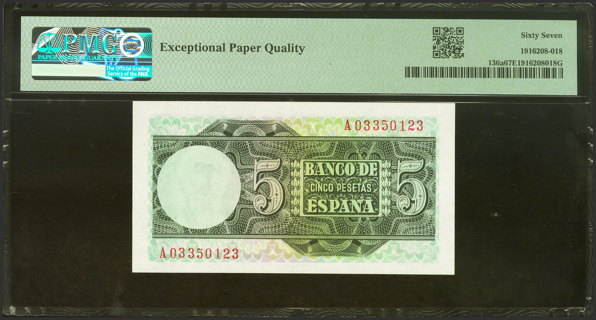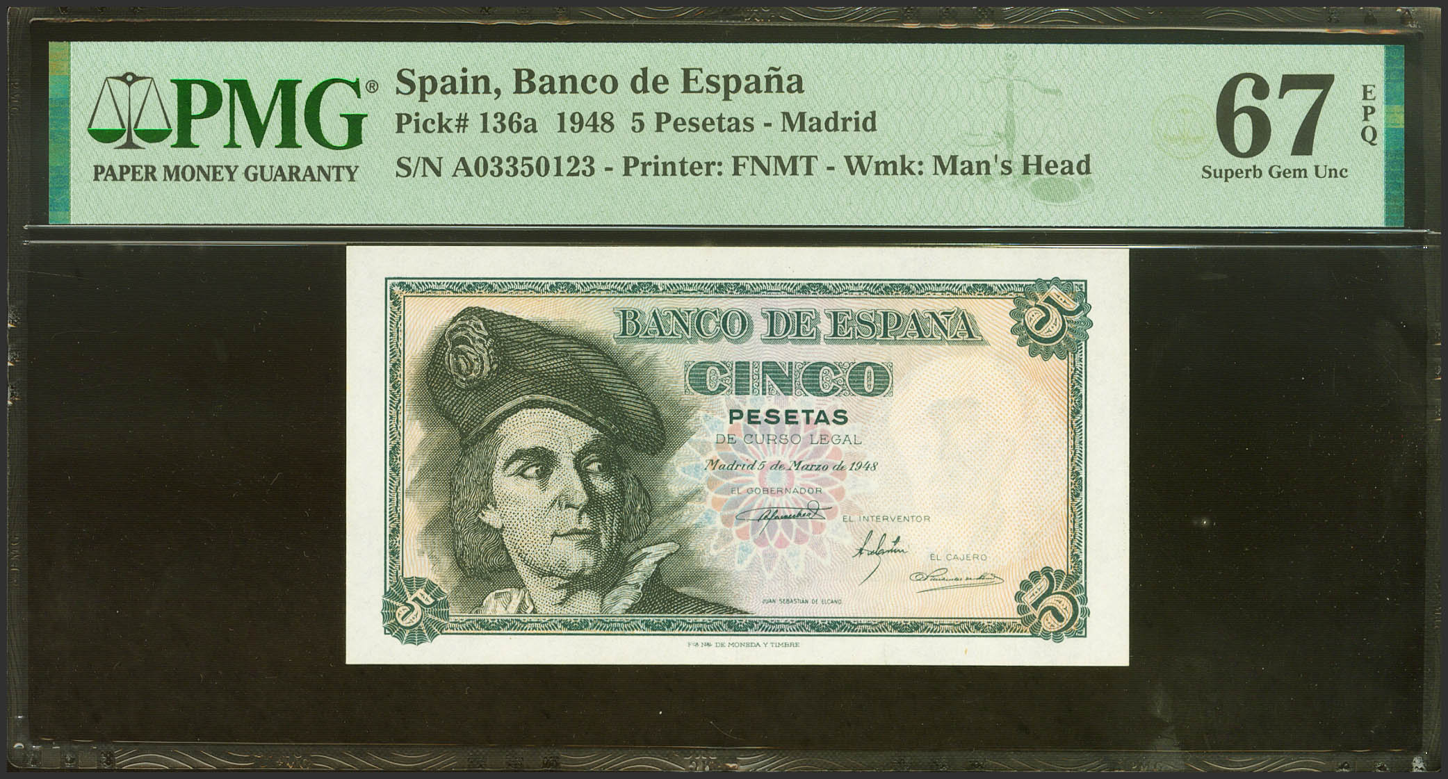 5 Pesetas. March 15, 1948. Series A. (Edifil 2023: 455a, Pick: 136a). Original sizing. Uncirculated. PMG67EPQ package.