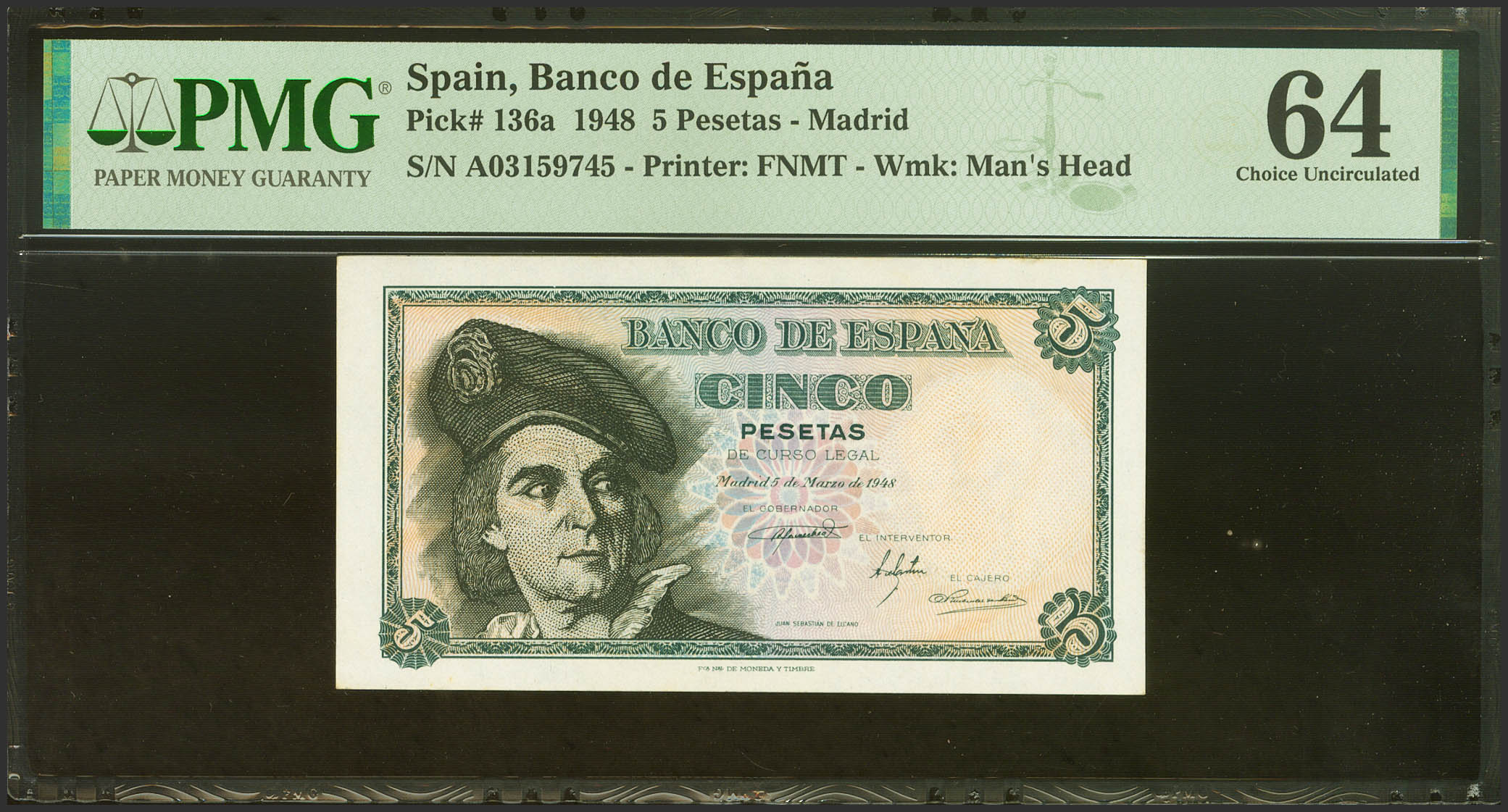 5 Pesetas. March 5, 1948. Series A. (Edifil 2021: 455a, Pick: 136a). Uncirculated. PMG64 encapsulation.