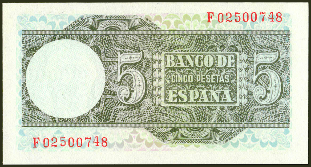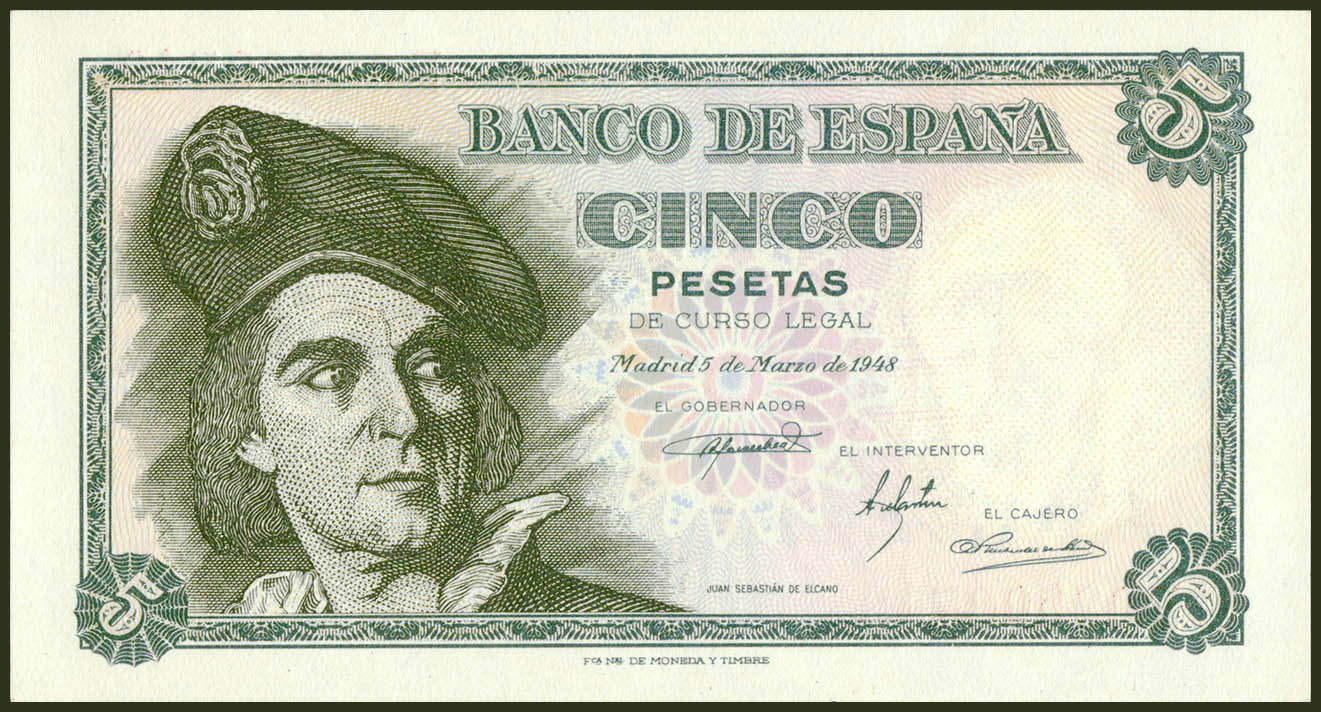 5 Pesetas. March 5, 1948. Series F. (Edifil 2021: 455a). Original sizing. Almost Uncirculated.